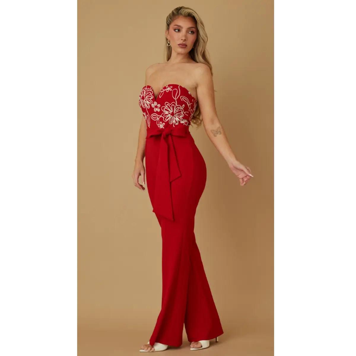 FLOWER STRING PATTERN JUMPSUIT - CURVED PLUNGING CHEST LINE - STRAPLESS - ADJUSTABLE TIE WAIST BELT - ZIPPER ON THE BACK - RED - CASUAL FASHION