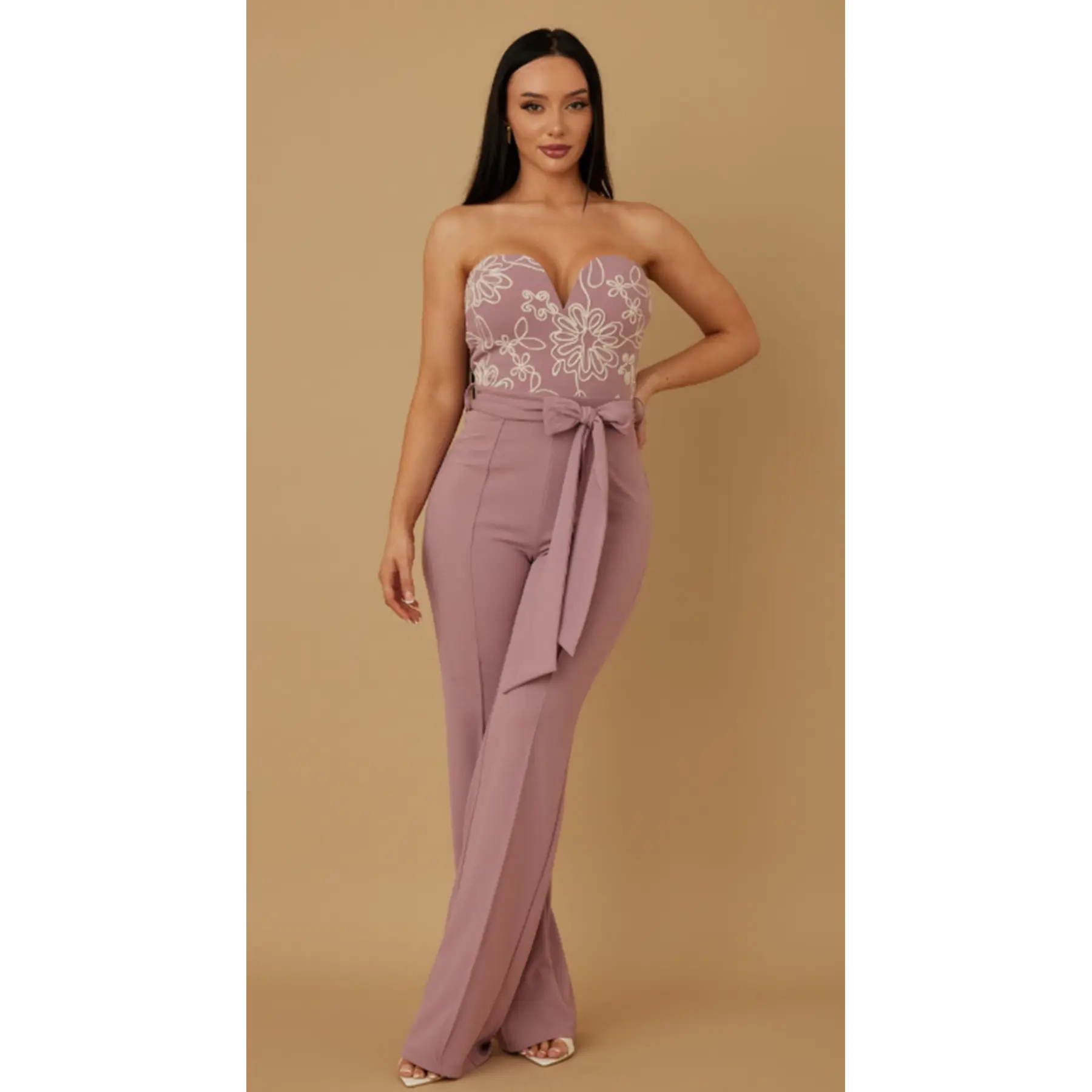 Discover the FLOWER STRING PATTERN JUMPSUIT, a masterpiece of modern fashion. This jumpsuit features a curved plunging chest line, enhancing your silhouette beautifully. The strapless design offers a sleek, uninterrupted look. An adjustable tie waist belt ensures a perfect fit, while a zipper on the back adds a functional touch. Ideal for those who appreciate both style and comfort.