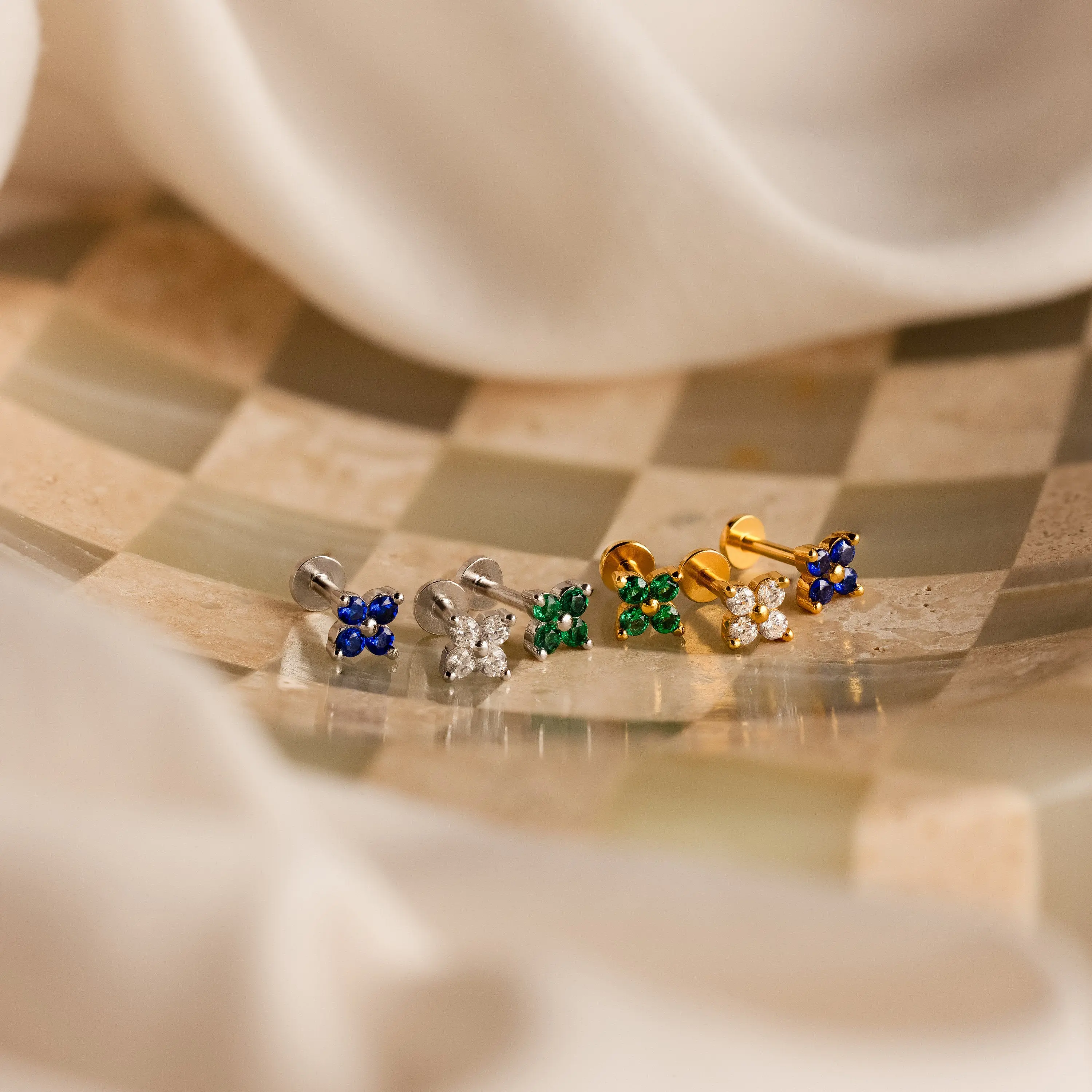 If you love to wear your earrings anytime, anywhere our Flower Stud Earrings Set is right up your alley. With their flat back design and dainty gemstones in Diamond, Sapphire and Emerald this set are sure to be your favorite earrings for nap or relaxation time.