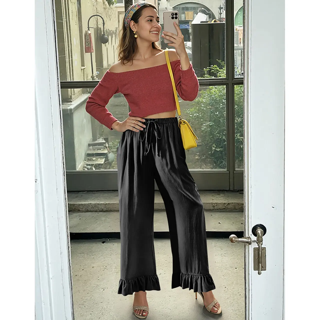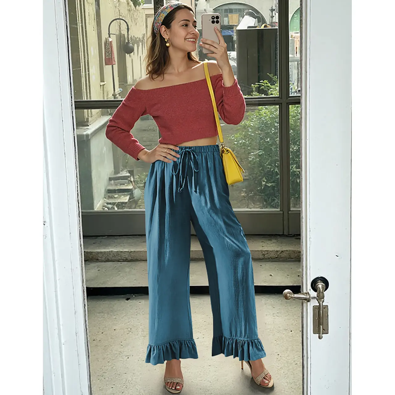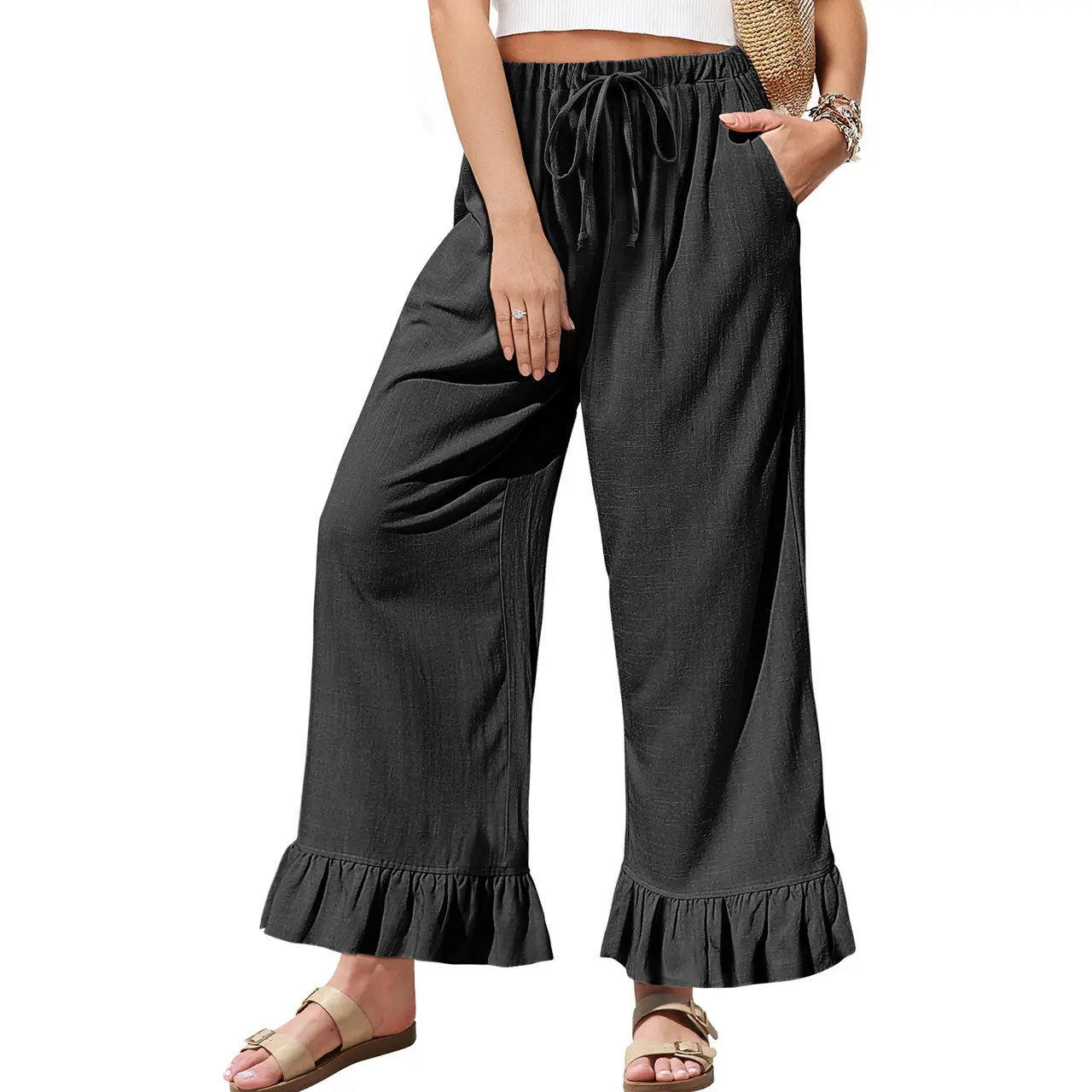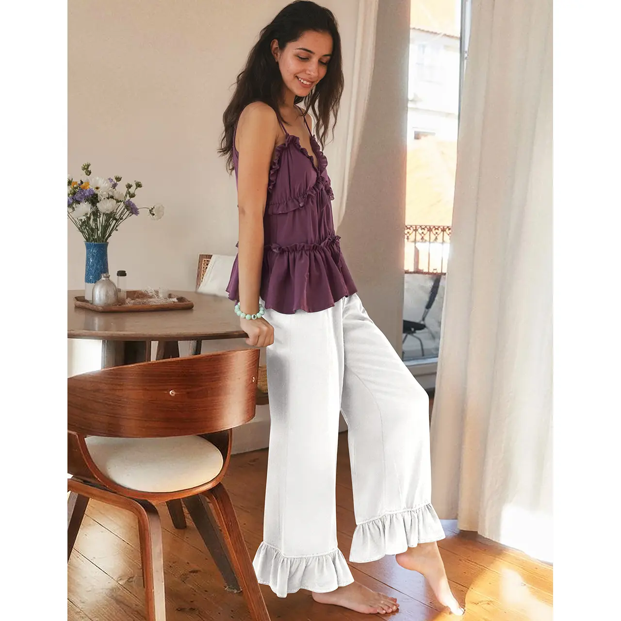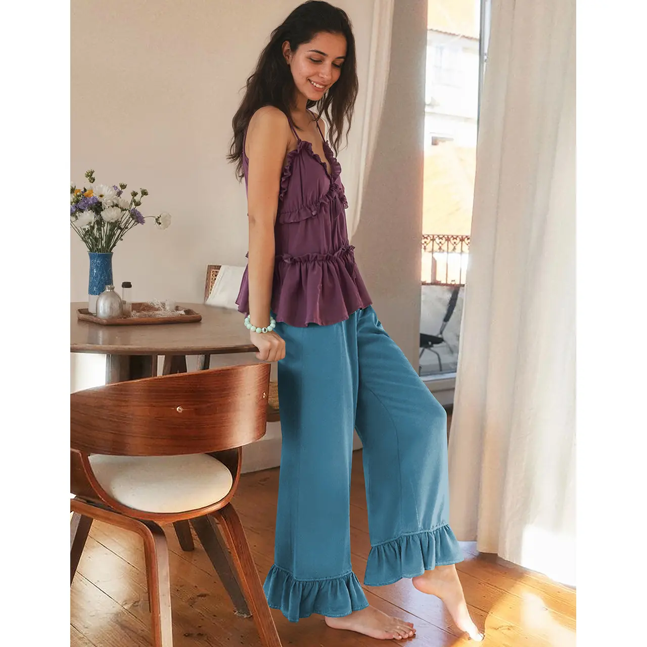 Ruffled cuffs add a vintage, feminine touch to the relaxed wide-leg silhouette. A soft elastic waistband with drawstring ensures a snug yet flexible fit for all-day comfort.