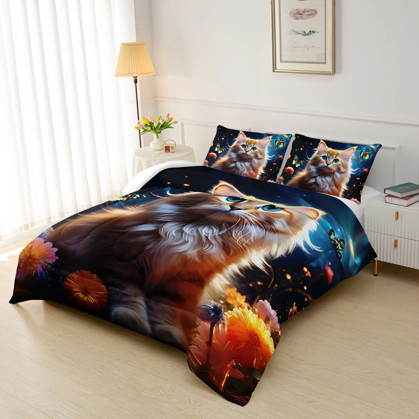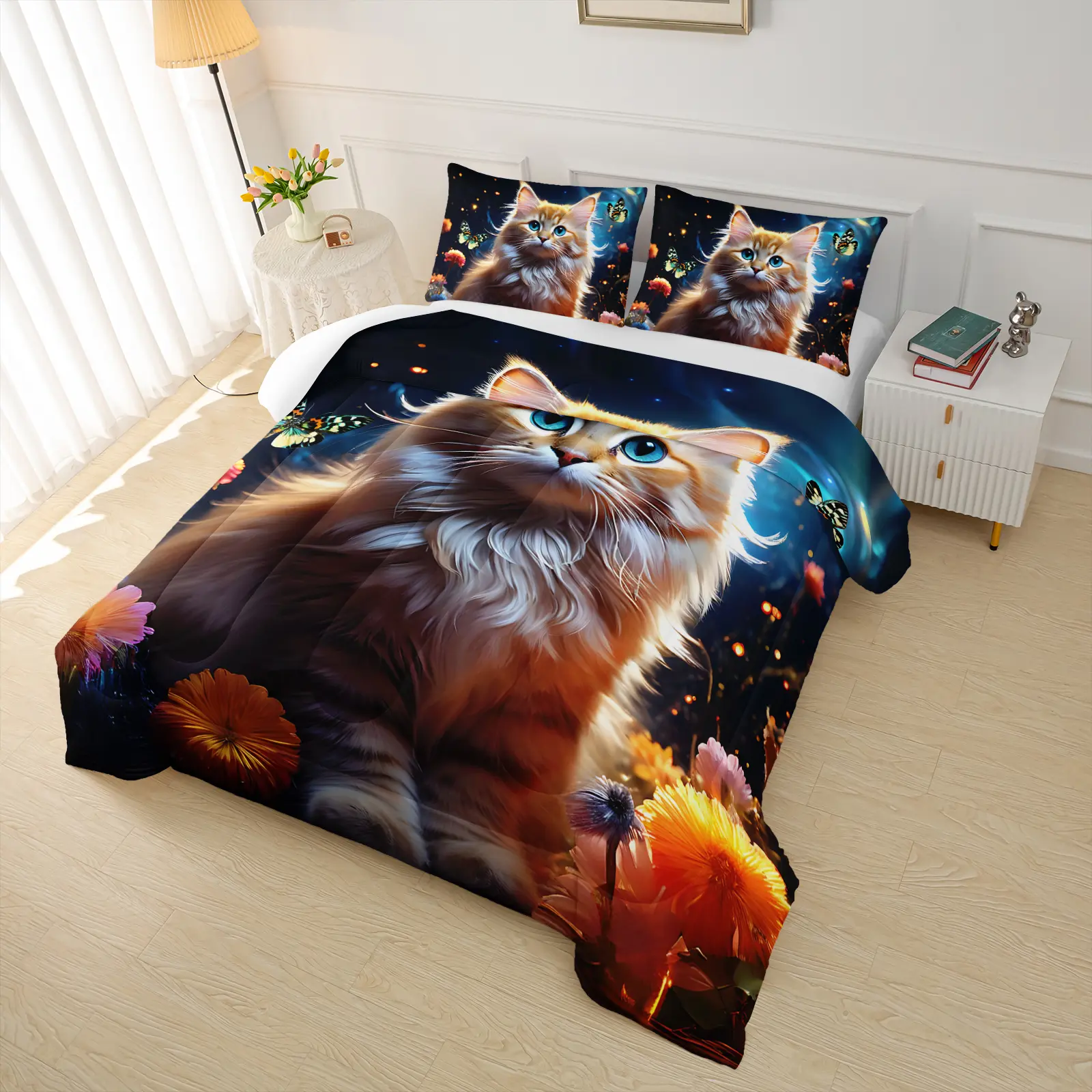 3pcs Fluffy Cat Comforter Set, Animal Duvet Set for Girls and Adults Bedroom or Guest Room Decor, Luxury Soft All Seasons Comforter Machine Washable Microfiber Quilt with 2 Pillowcases , Gifts for the Family