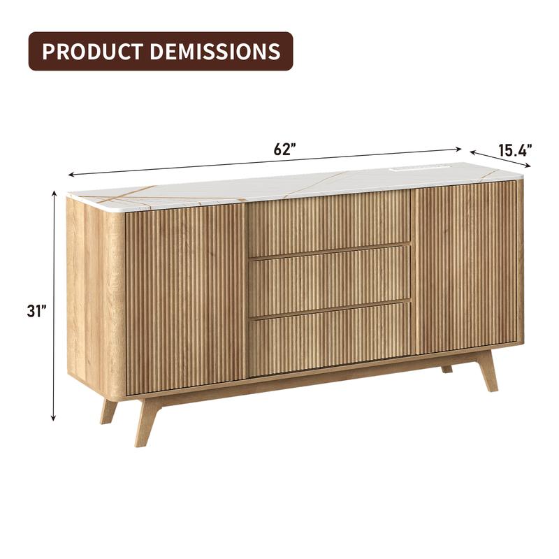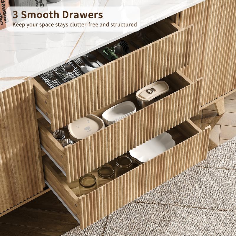 Expansive Storage Capacity: This buffet cabinet features 2 spacious cabinets with 2 adjustable shelves, 3 smooth-gliding drawers, offering 40% more storage than standard sideboards. Perfect for organizing dinnerware, glassware, linens, or kitchen essentials, its roomy interior (Dimensions: 15.4"D x 62"W x 31"H) ensures clutter-free dining room, living area, or entryway