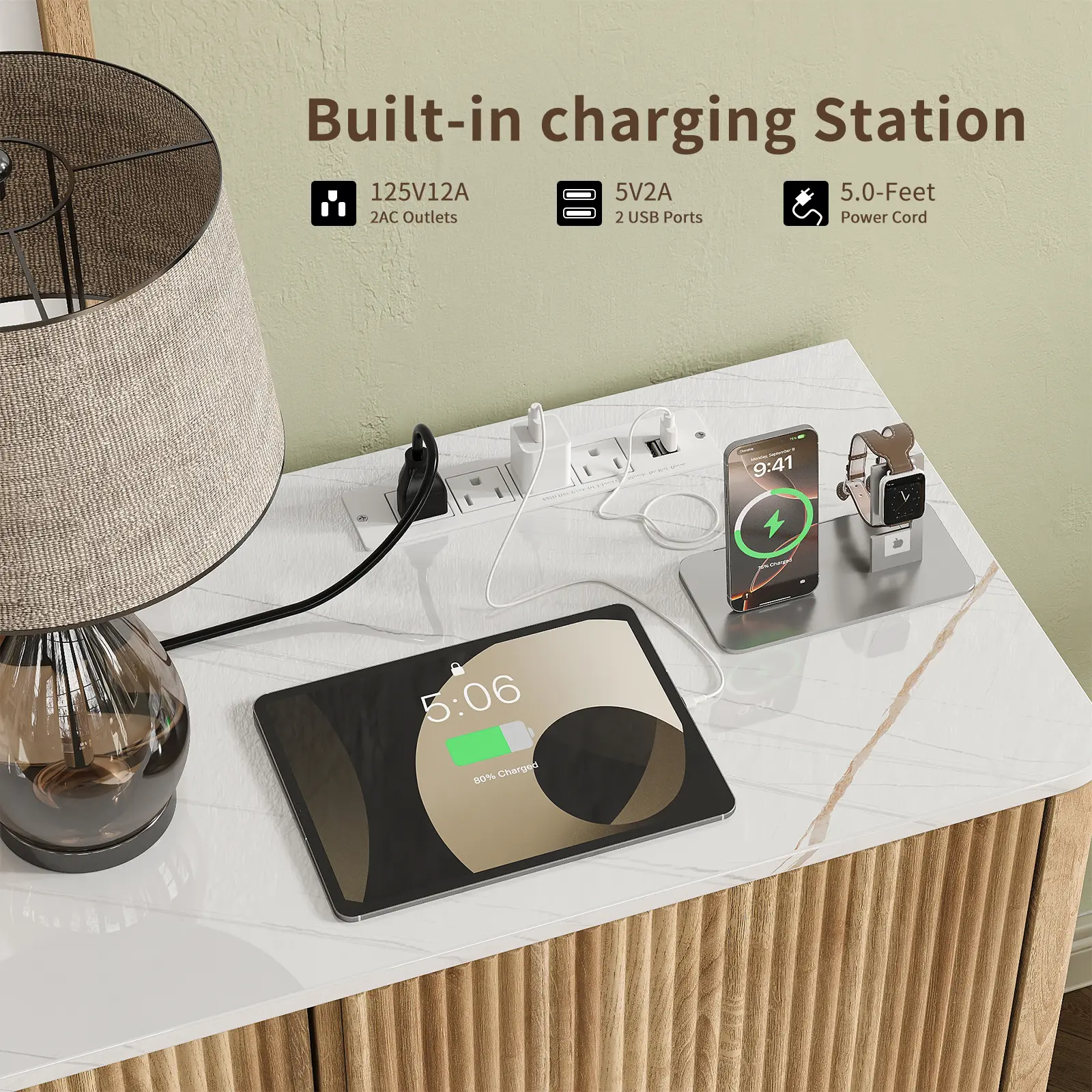 Built-In Power Outlet: Designed for modern convenience, this sideboard includes 2 integrated USB ports and 4 AC outlet—ideal for charging devices, powering coffee makers, or illuminating decorative lighting