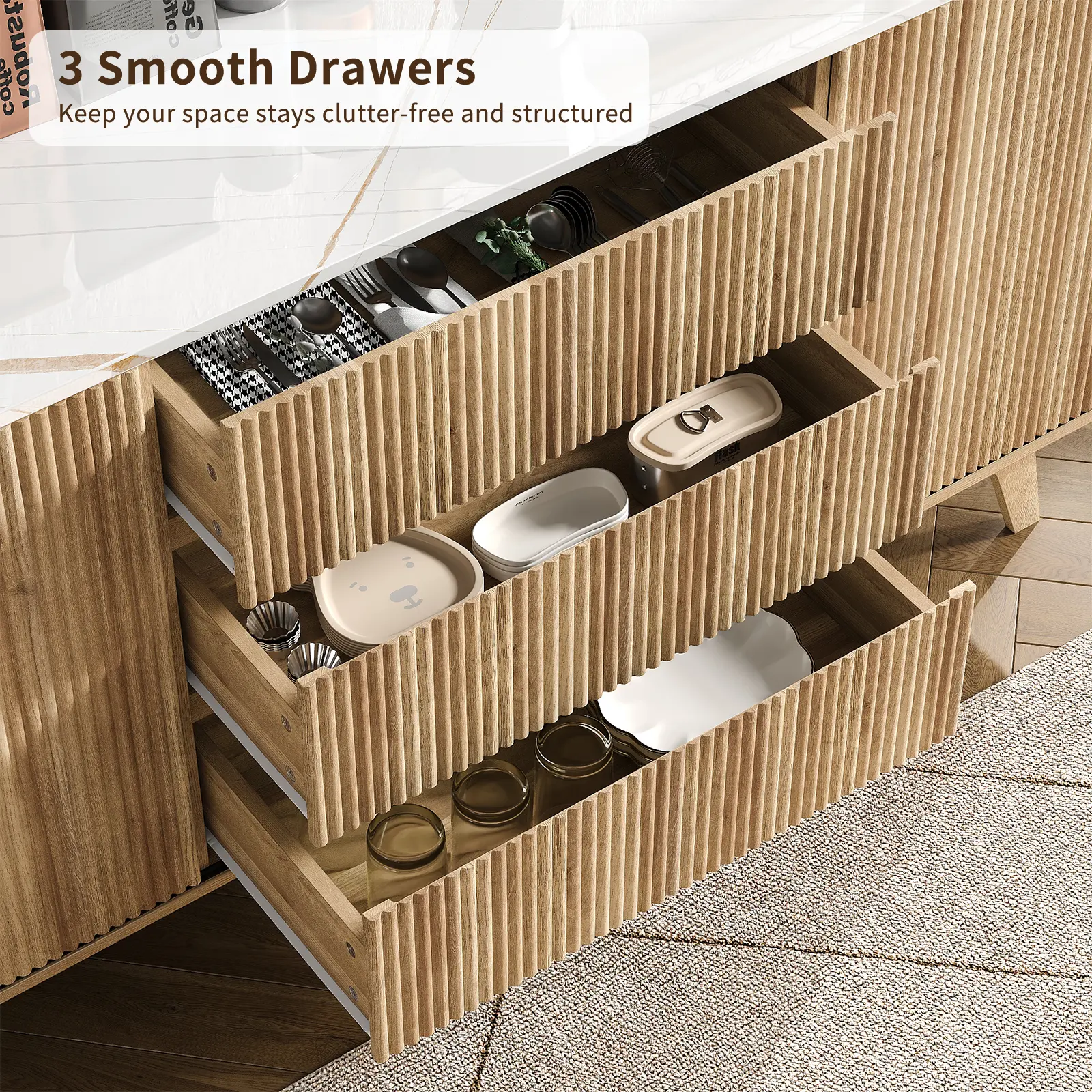 Fluted Elegance, Versatile Style: The fluted sliding doors and minimalist profile add refined texture to any space. Use it as a sideboard, TV console, coffee bar, or entryway organizer—seamlessly blending with farmhouse, mid-century, or contemporary decor