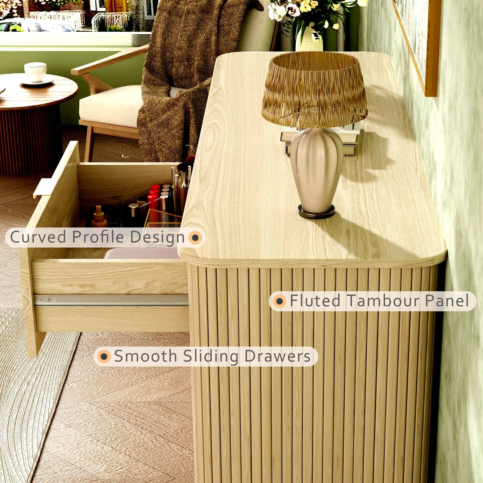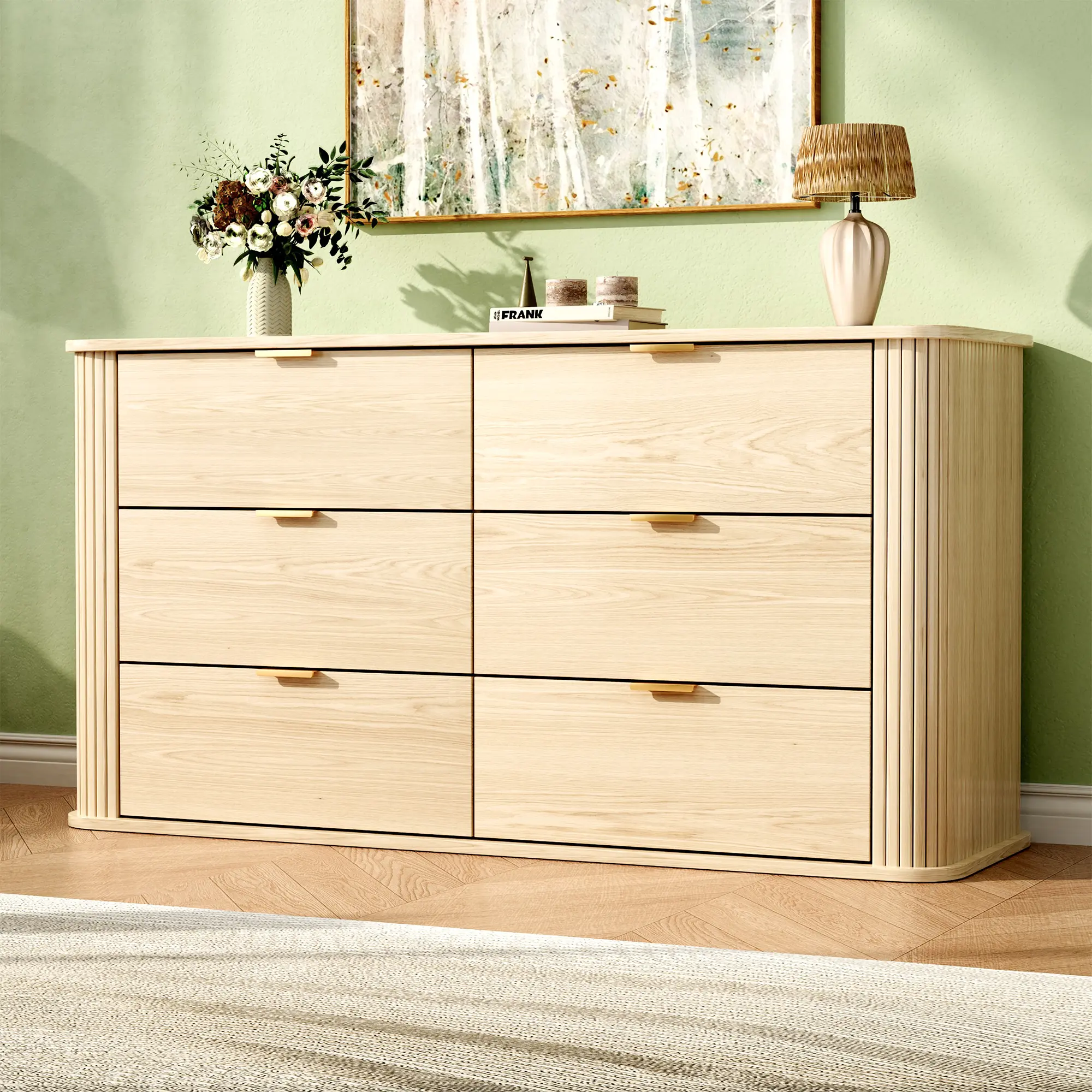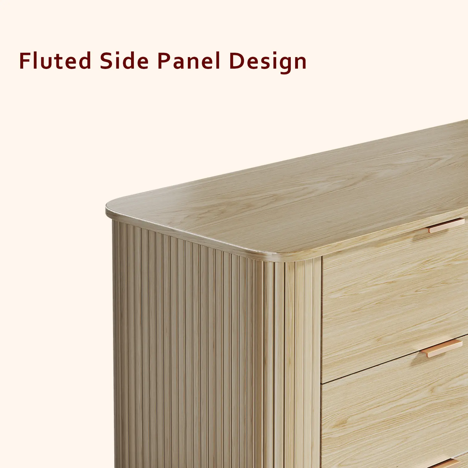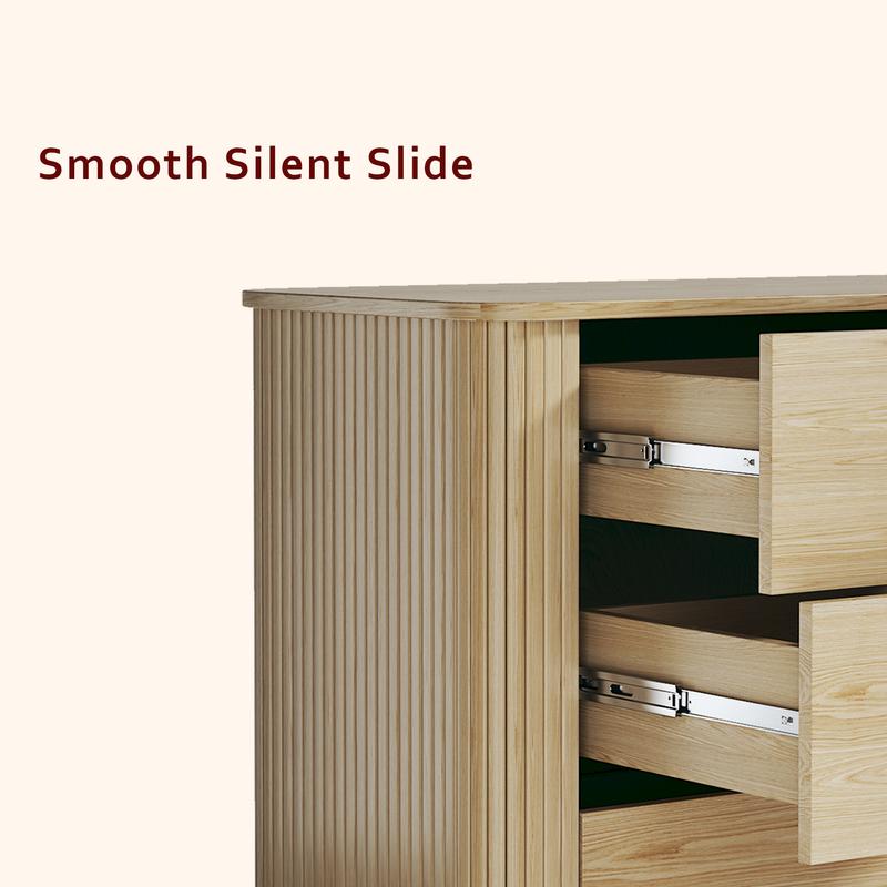 ·Elevate Your Space with Timeless Elegance:This 6-Drawer Fluted Dresser combines mid-century modern charm with contemporary functionality, making it the perfect addition to any room. Its sleek tambour panel and gracefully curved sides add a touch of sophistication, while the wide metal handles and splayed legs enhance its modern appeal.