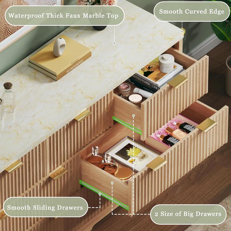 ·Natural Aesthetic Fluted Dresser: This modern dresser features an elegant fluted design panel, faux marble top, gold handles that exude timeless elegance chic twist. Combining the curved sturdy base, the curved profile enhances its mid-century modern and natural appeal that can fit any place, creating a unique focal point to any area. This fluted dresser is ideal for spaces like the hallway, living room, and bedroom, offering both visual appeal and everyday utility.