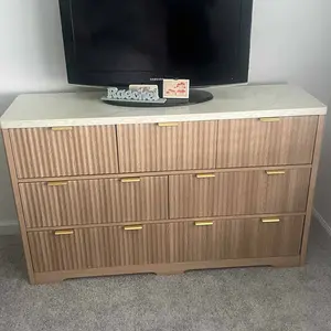 7 drawer modern fluted dresser with the natural wood look and heavy marble top! Gorgeous dresser that I am using as a tv stand and game room storage! #flutedfurniture #fluteddresser #7drawerdesser #largedresser #tiktokfurniture