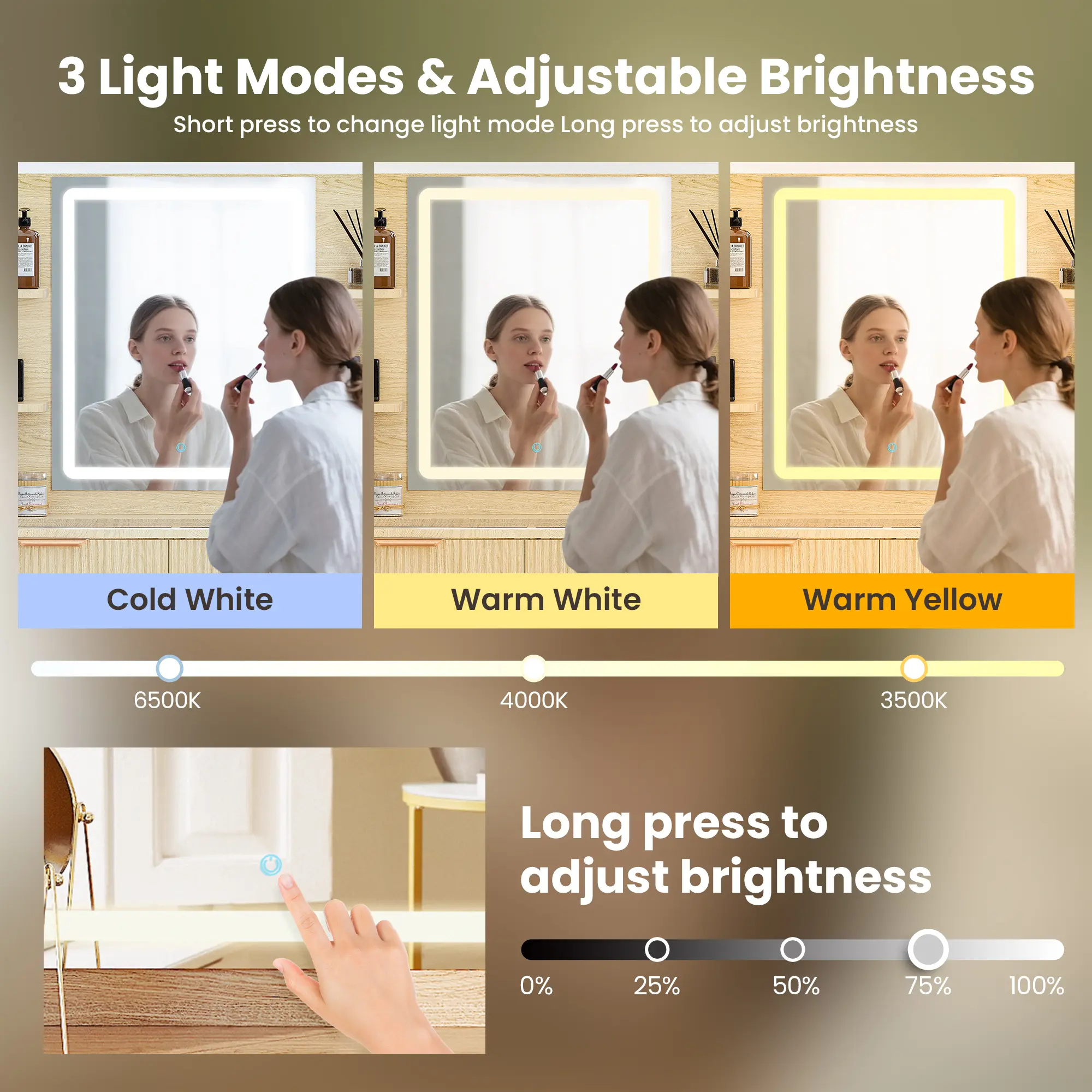 ·LED Mirror and Customizable Lights: The LED mirror will prioritize your makeup experience, which can reflect your appearance more clearly from every angle.The adjustable LED mirror provides three lighting modes—Cool (6500K), Warm (3500K), and Natural (4500K)—with touch controls to switch modes and adjust brightness. Ideal for different scenes as home, salons, and studio makeup applications