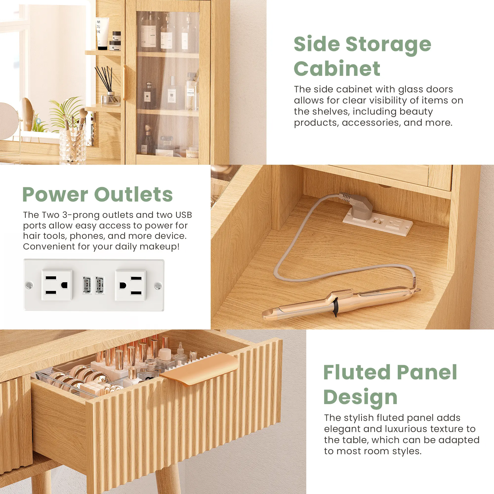·Vanity Table with Charging Station: Built-in power outlets support hairdryers, straighteners, or chargers. This vanity table allow you to conveniently connect and charge hair tools, smartphones, tablets, and other devices, making this vanity practical for daily use. Also, this vanity organizer is a great gift for birthdays, Valentine's Day, Mother's Day, and Christmas