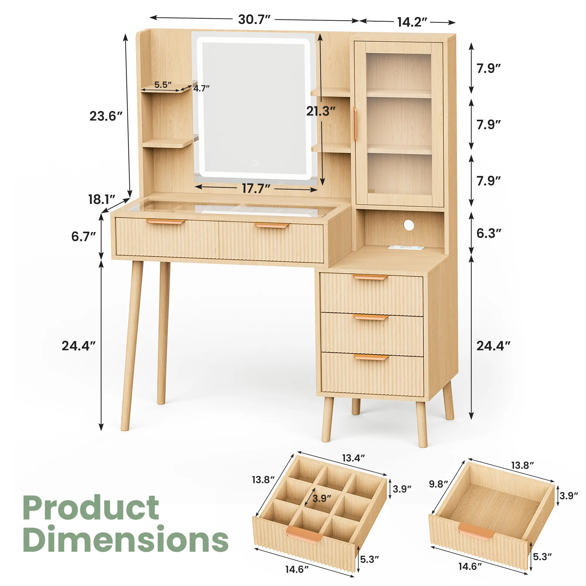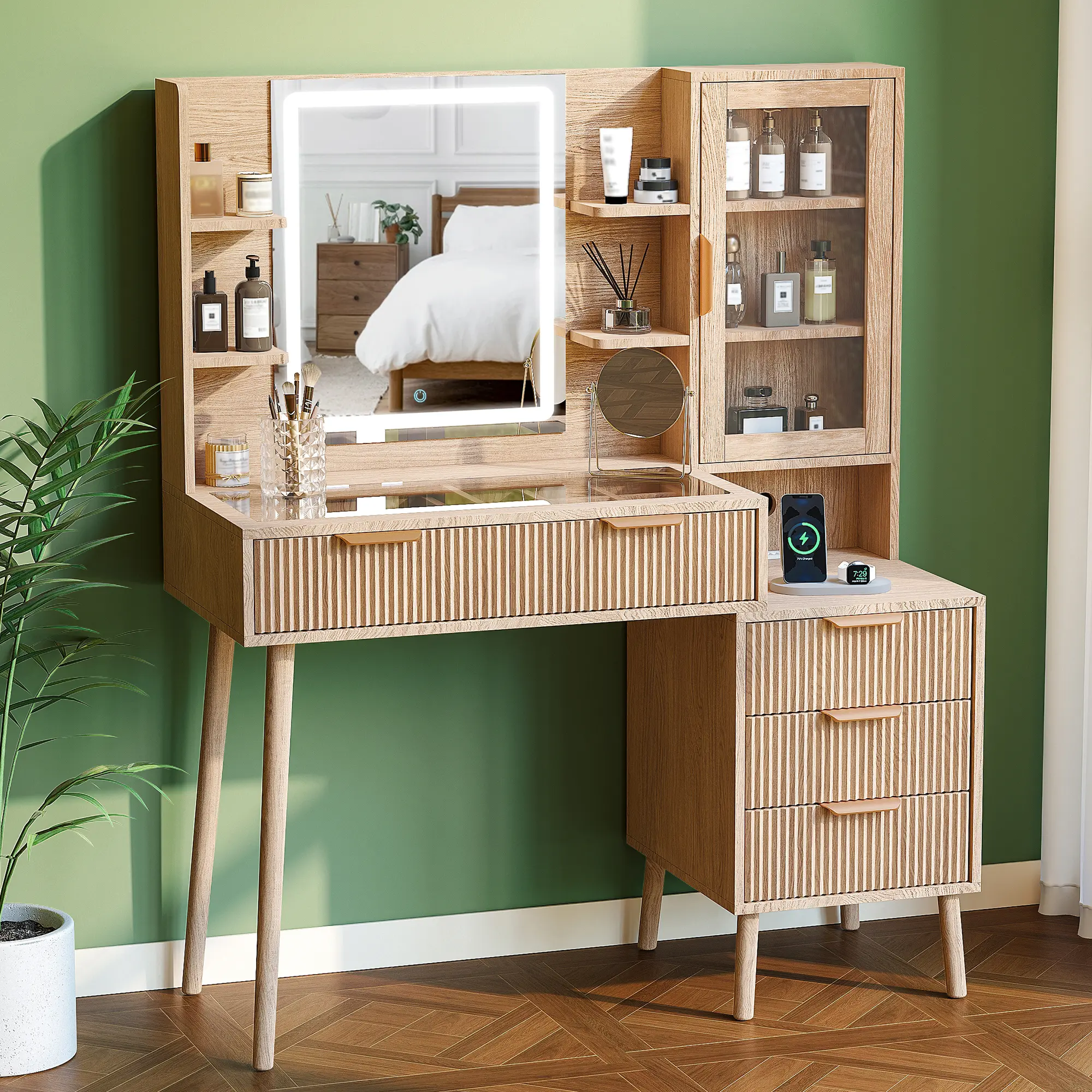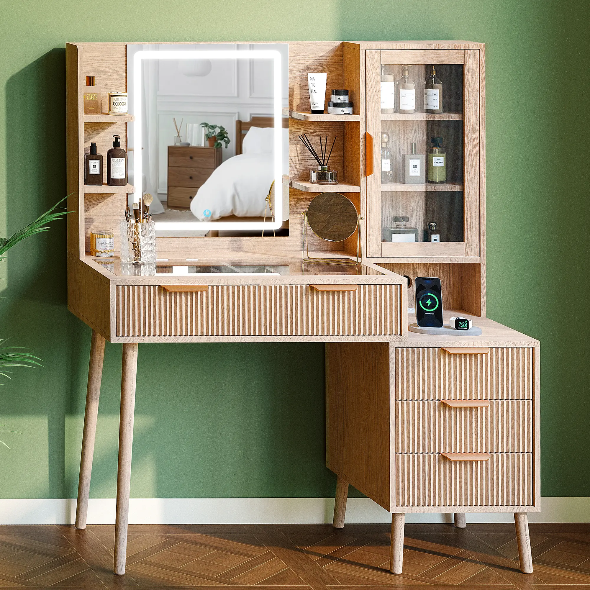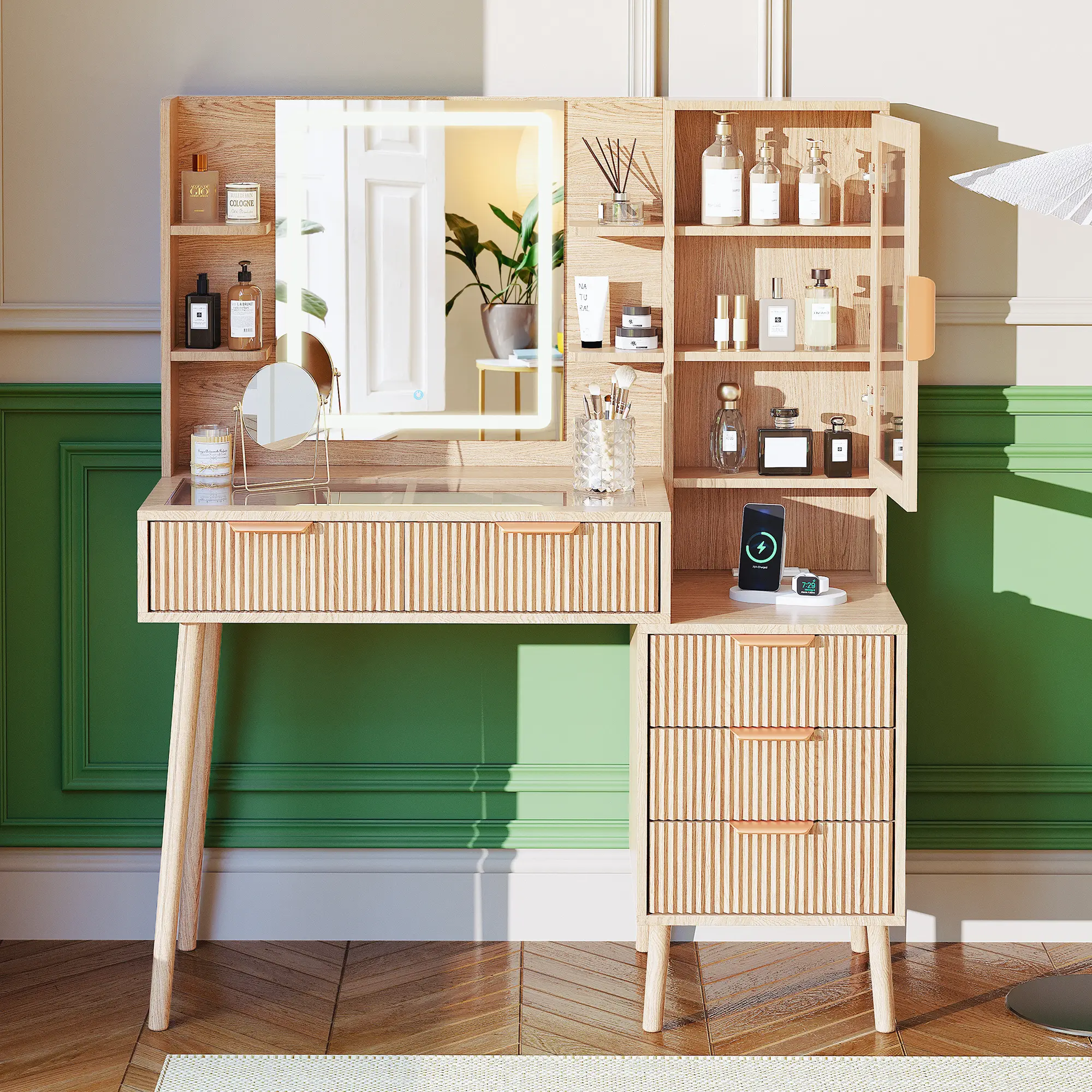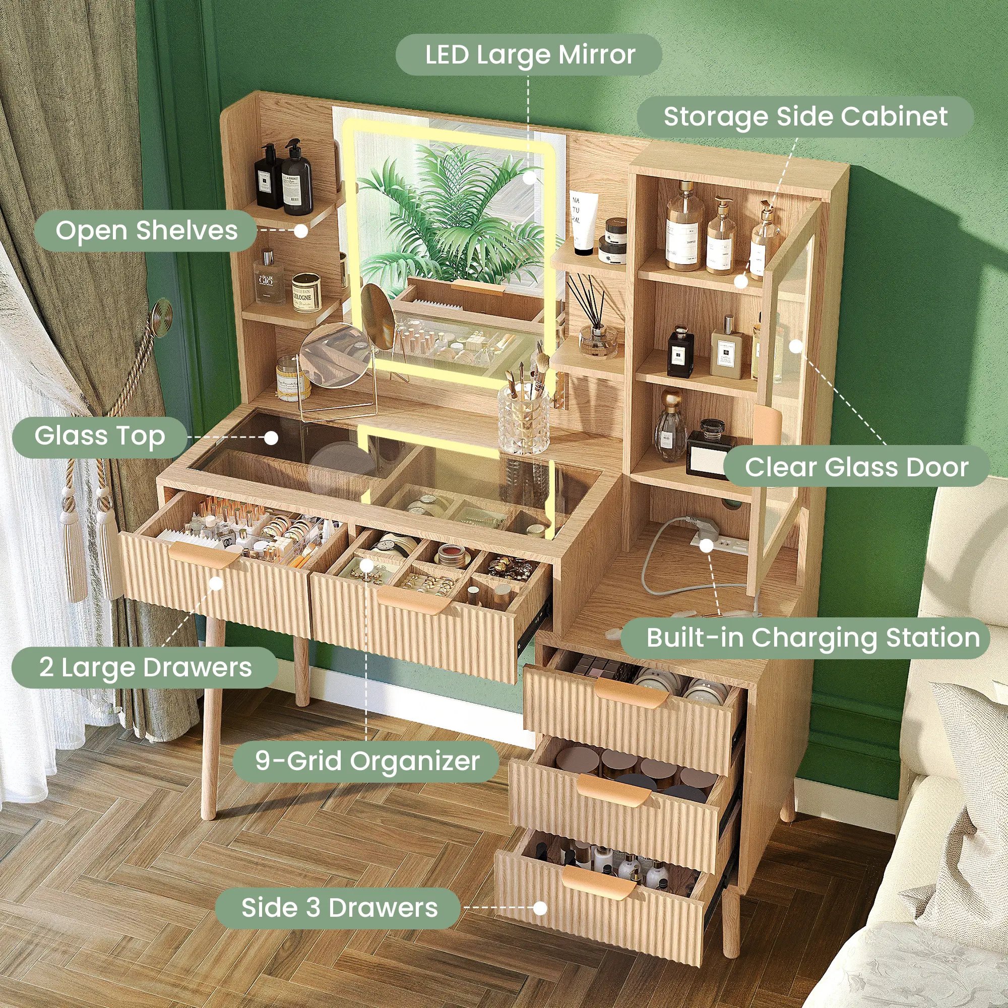 ·Makeup Organizer with Visible Drawer: This fluted makeup vanity includes 2 large drawers, 3 storage drawers, 1 storage cabinet, and a spacious tabletop, keeping all your ornaments, cosmetics, skin care products, and other beauty essentials organized and accessible. With the clear glass tabletop, you can easily see and find the things needed inside the drawers a breeze