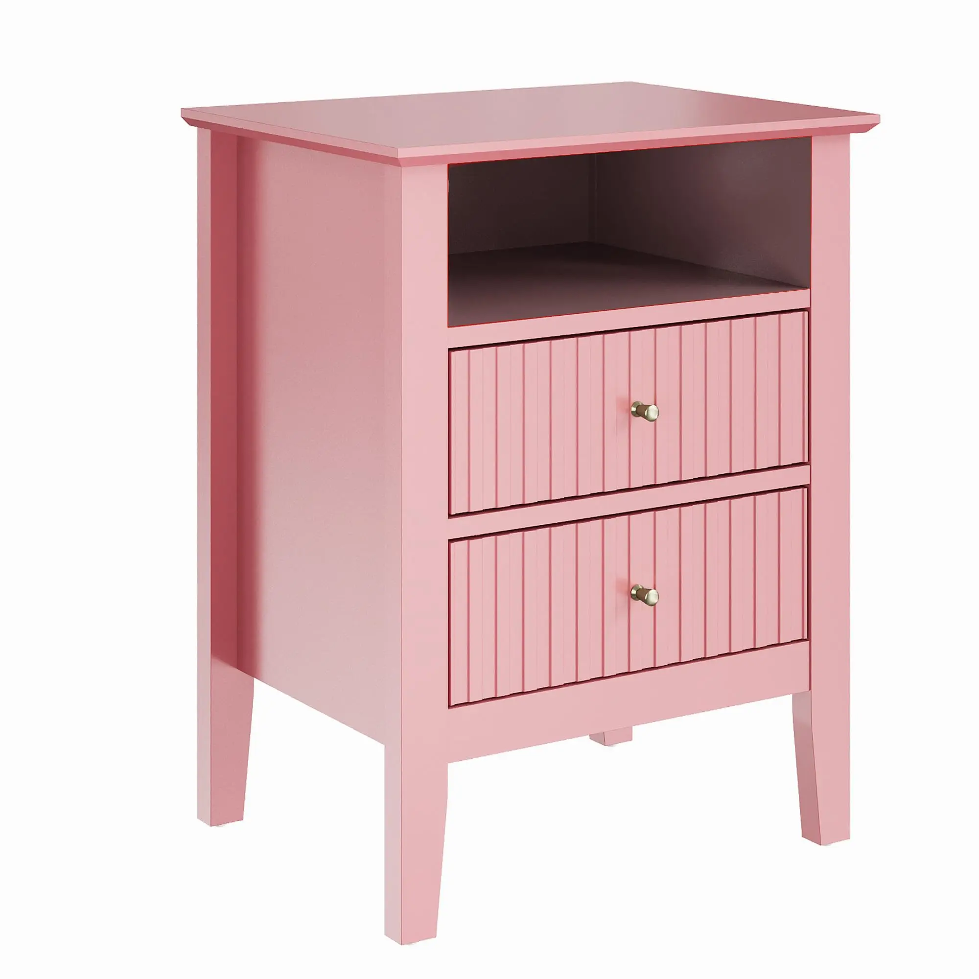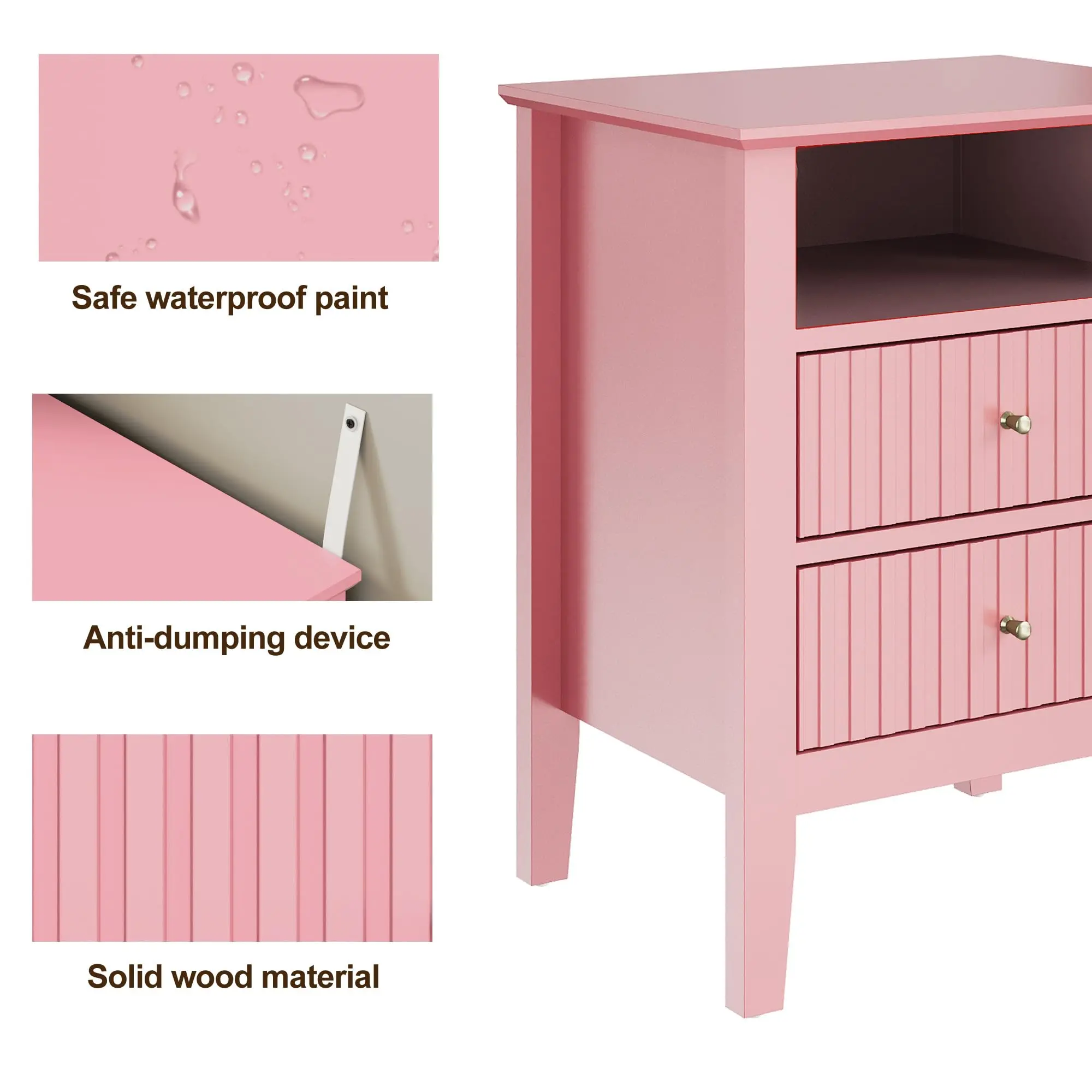 This stylish fluted nightstand blends elegance with practicality. With two spacious drawers for storage and a semi-open shelf for decor, it brings warmth and personality to any room. Made from durable P2 MDF with ASTM paint, it's both safe and easy to maintain. The quiet, anti-derailment drawer slides and anti-tip straps ensure safety and comfort. Perfect for any space, whether as a nightstand, side table, or entryway storage. Its sleek design complements any decor, offering both style and function, while exclusive customer service ensures your satisfaction with every purchase.