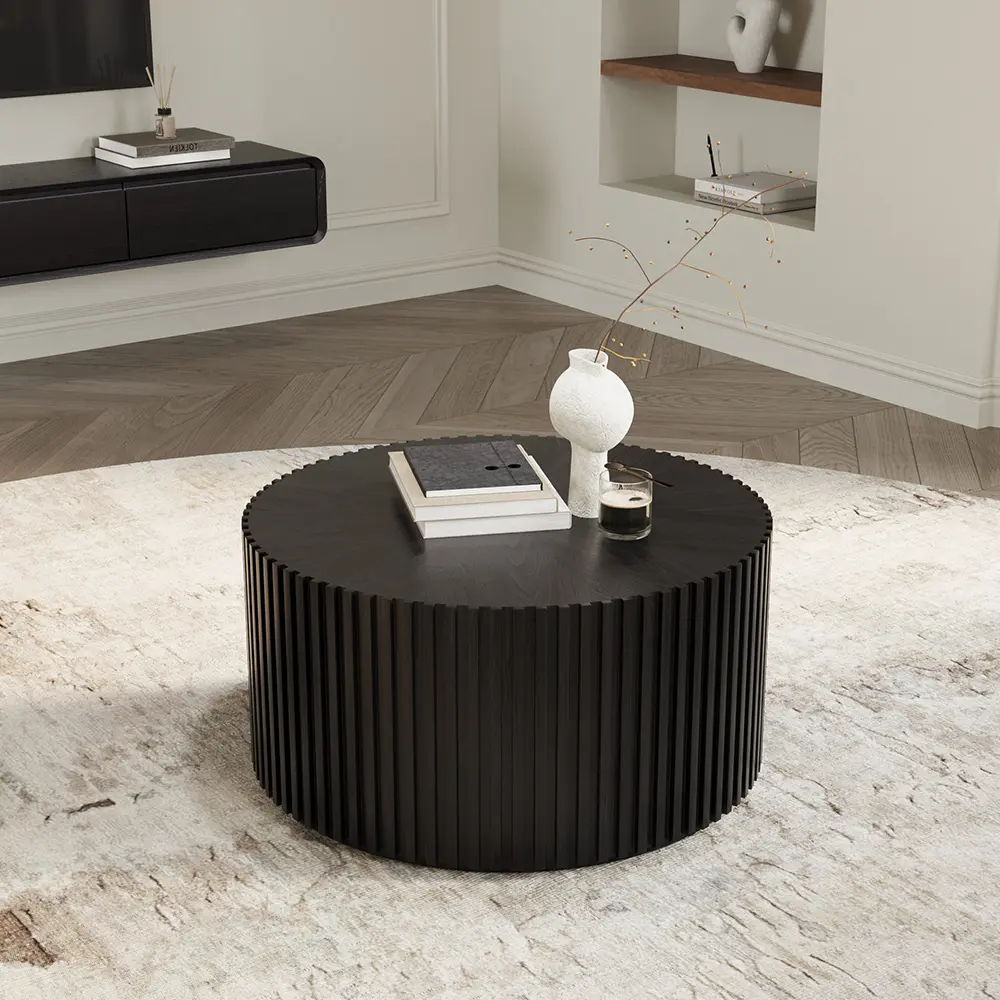 Fluted Round Coffee Table, Minimalist Wood Coffee Table, Mid Century Modern, Black Color, Fully Assembled, 31.5"
