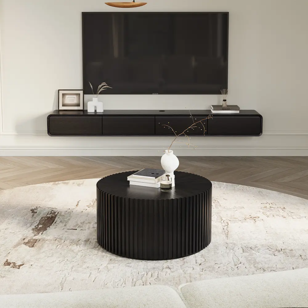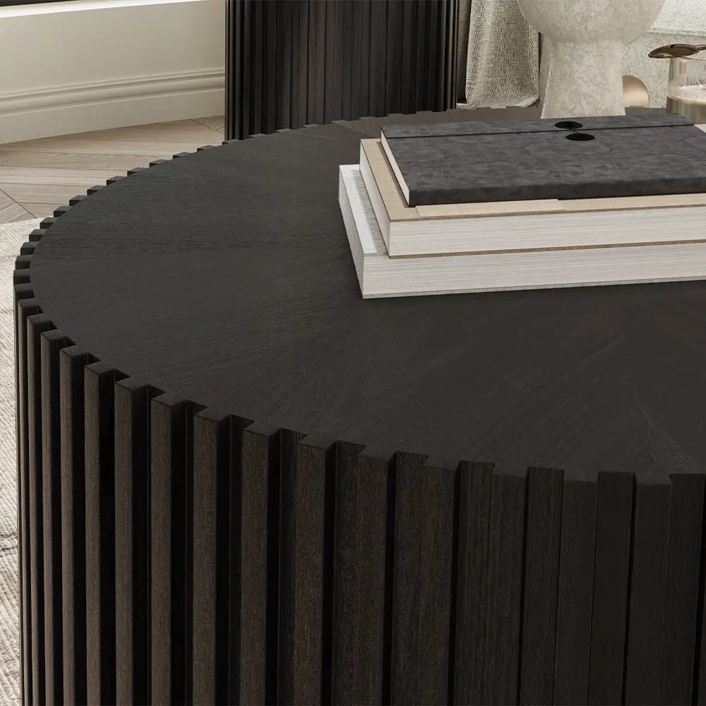 5. Fluted Round Coffee Table, Minimalist Wood Coffee Table, Mid Century Modern, Black Color, Fully Assembled, 31.5"