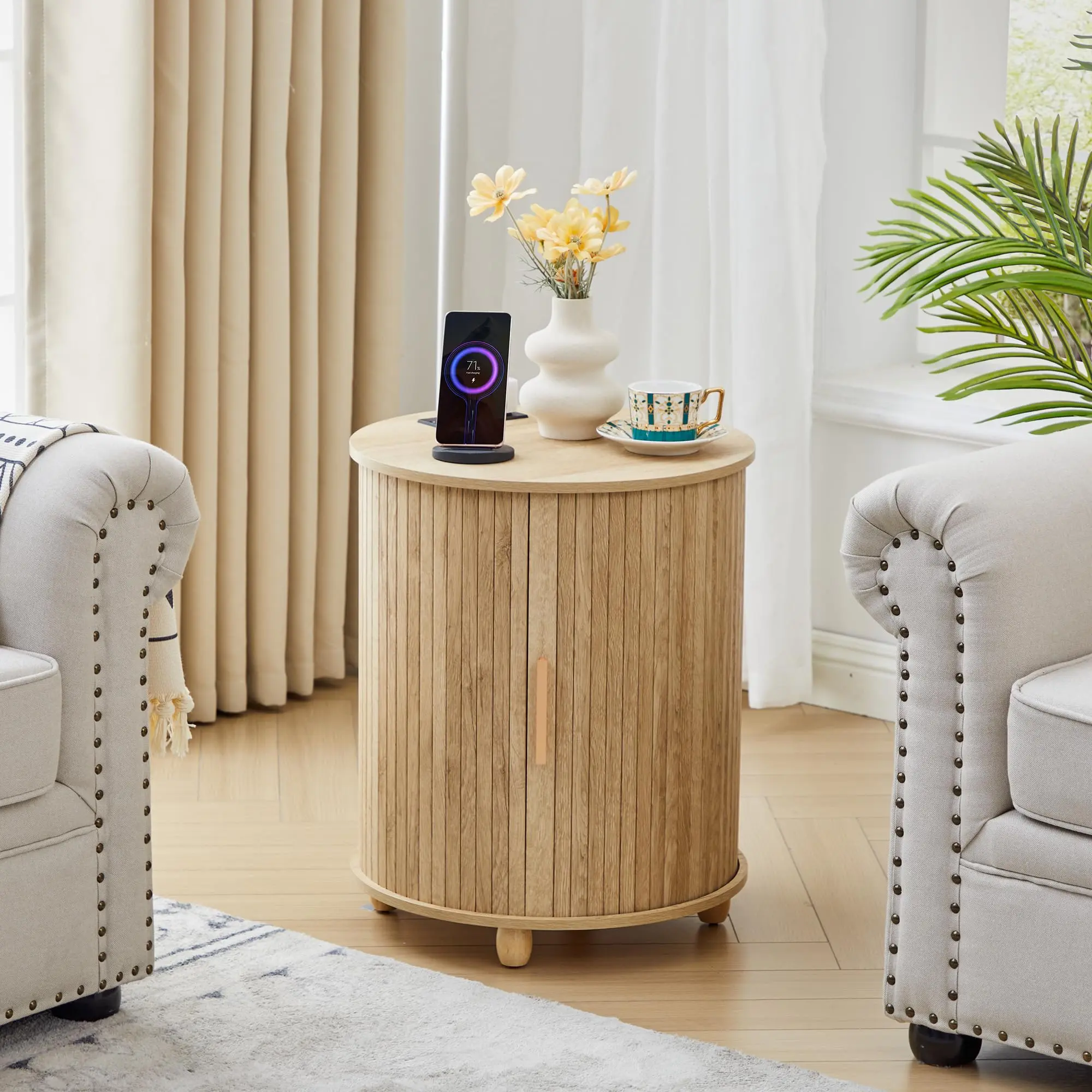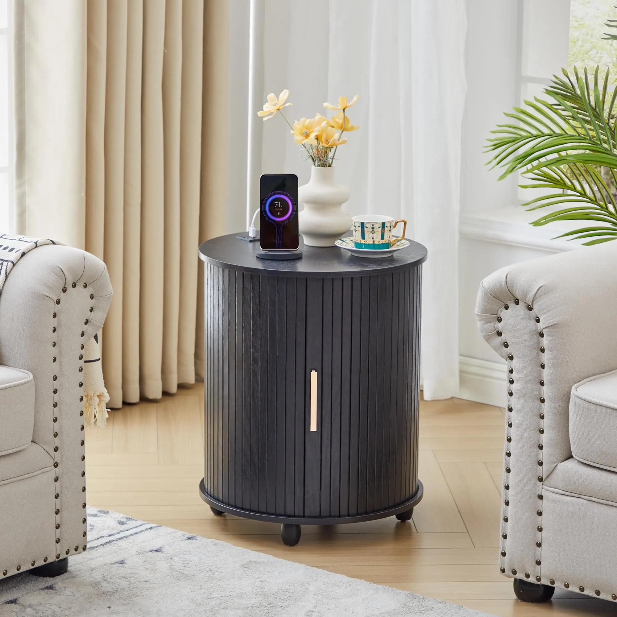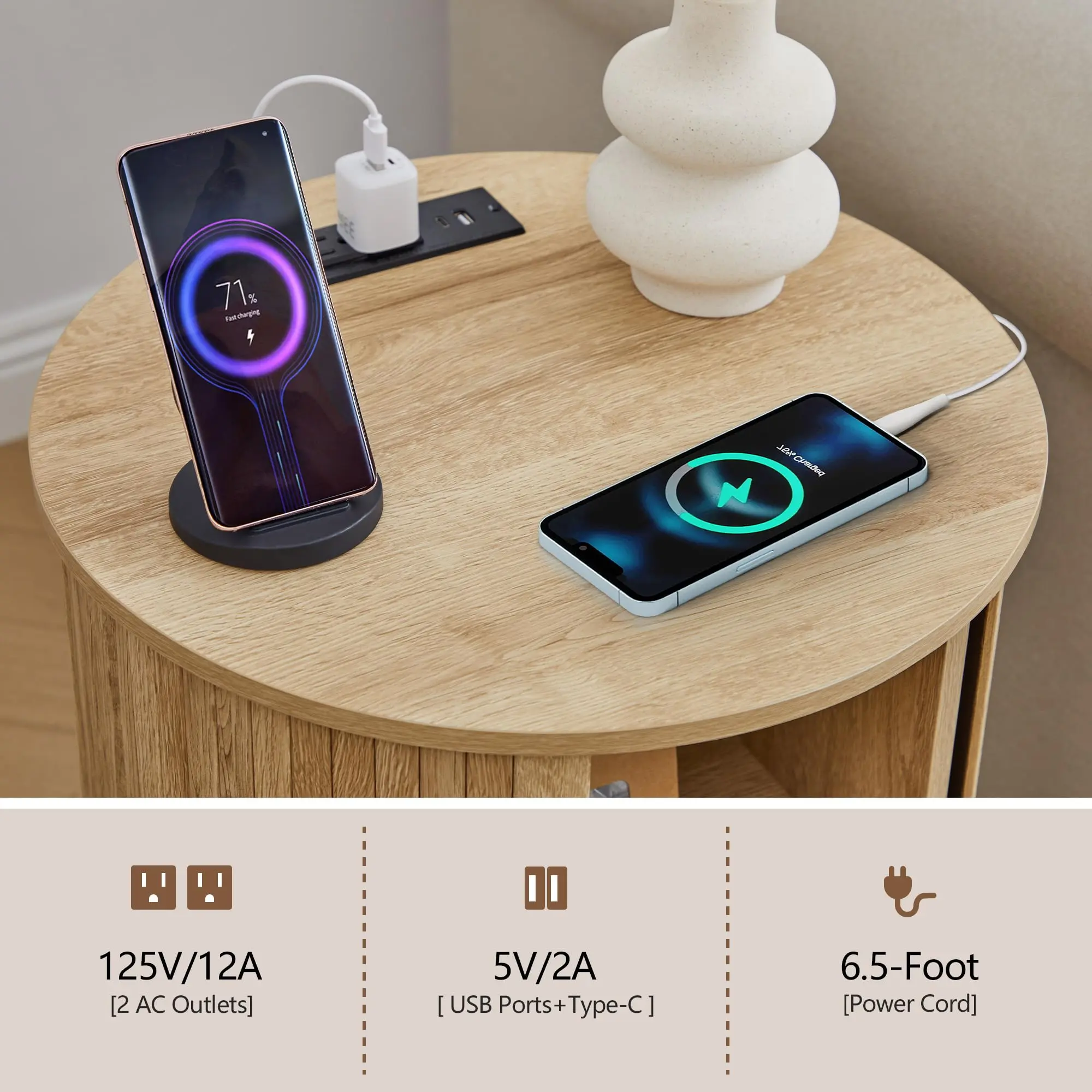 ·Built-In Charging Station for Everyday Convenience: Designed for modern homes, this round fluted end table features a built-in charging station equipped with 1 USB port, 1 Type-C port, and 2 AC outlets, allowing you to charge phones, tablets, and lamps directly from your sofa or bed. Perfect as a small end table with a charging station, it keeps cords organized and devices powered without sacrificing style or space.