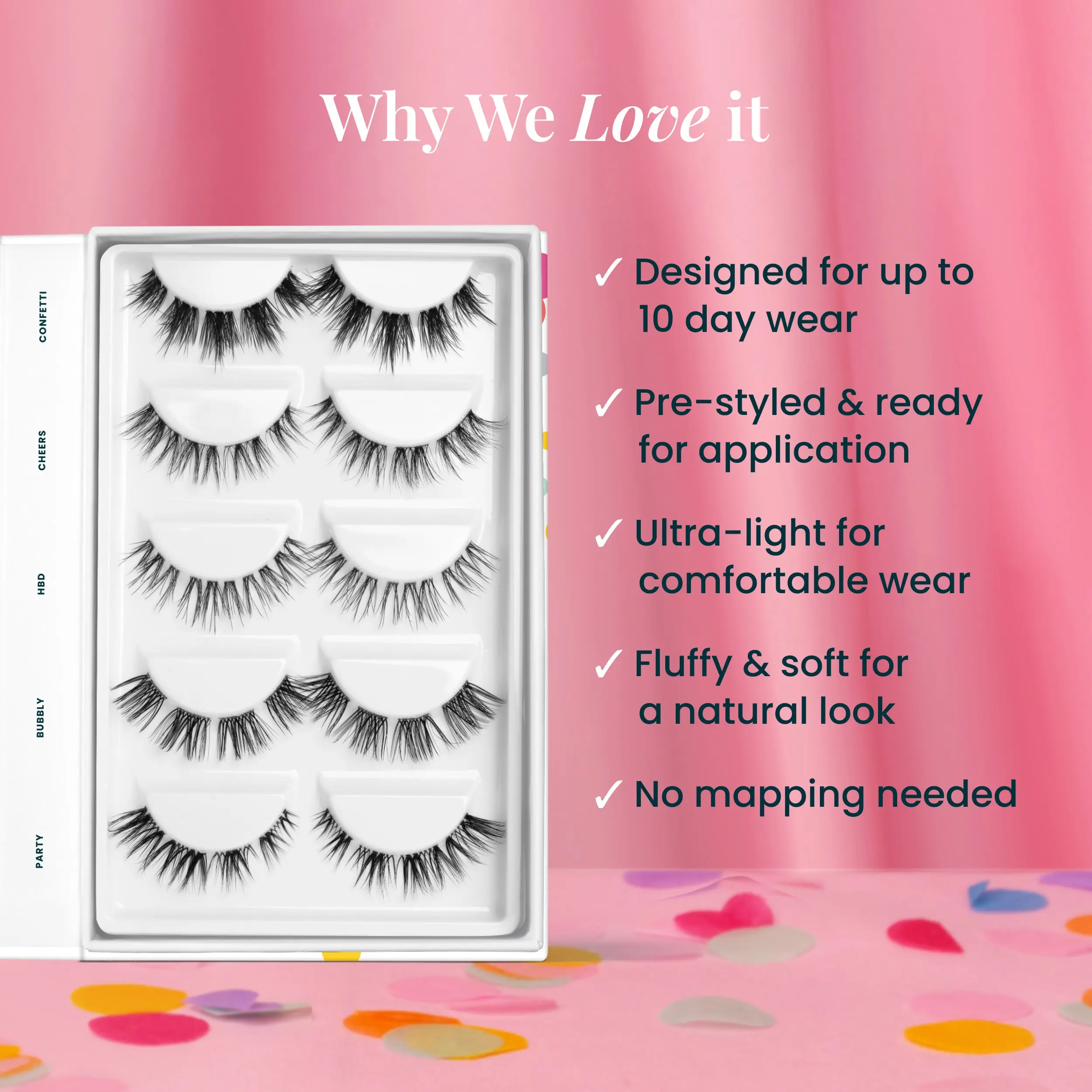 🎉 Celebrate with FlutterHabit's Birthday Edit! This limited-edition pack includes 5 pre-mapped pairs of cluster lashes and is perfect for every celebration. Celebrating six years of confidence and beauty, these lashes are designed for fun, cheeky confidence. Whether you're raising a glass or dancing, these lashes keep up with the celebration. Adhesive not included.