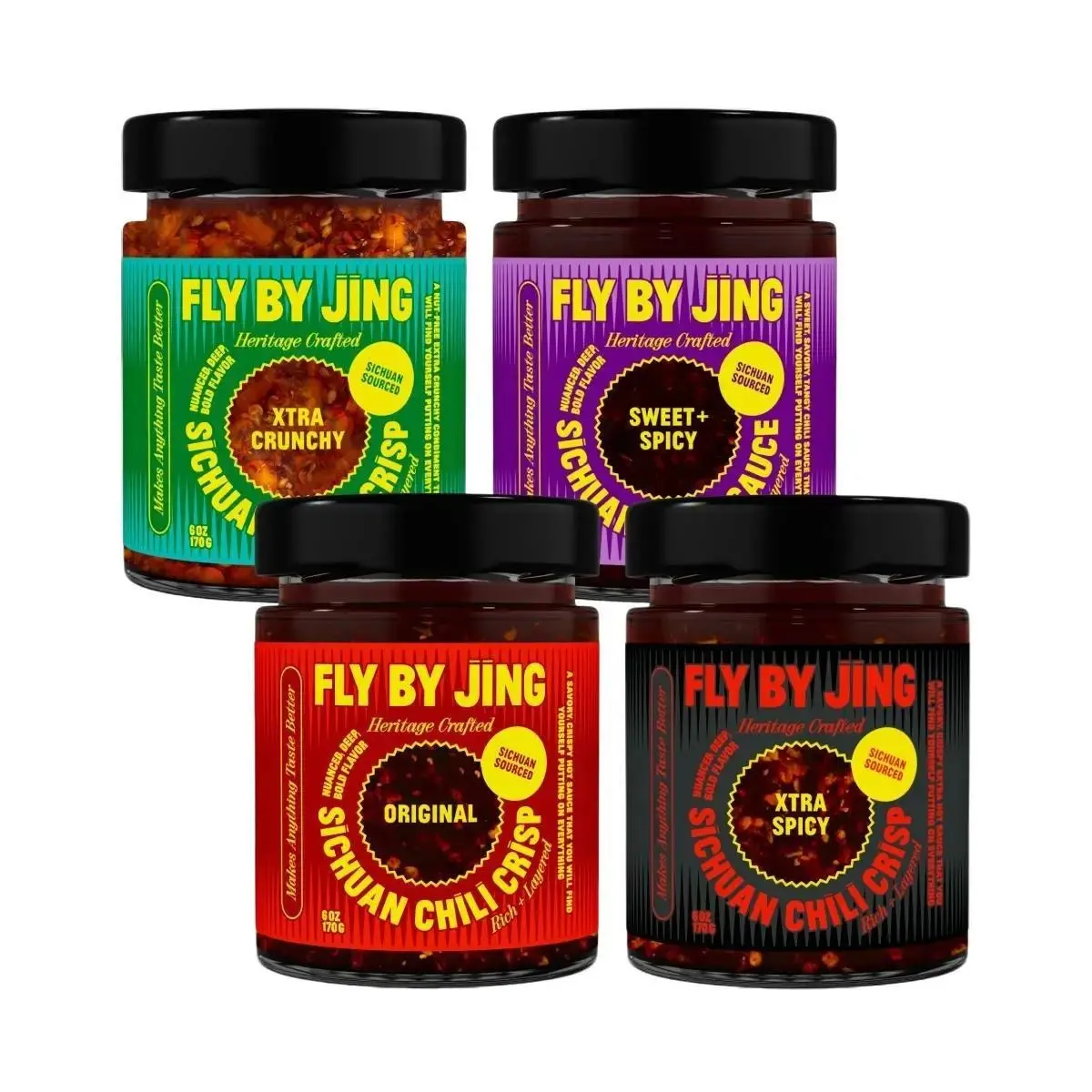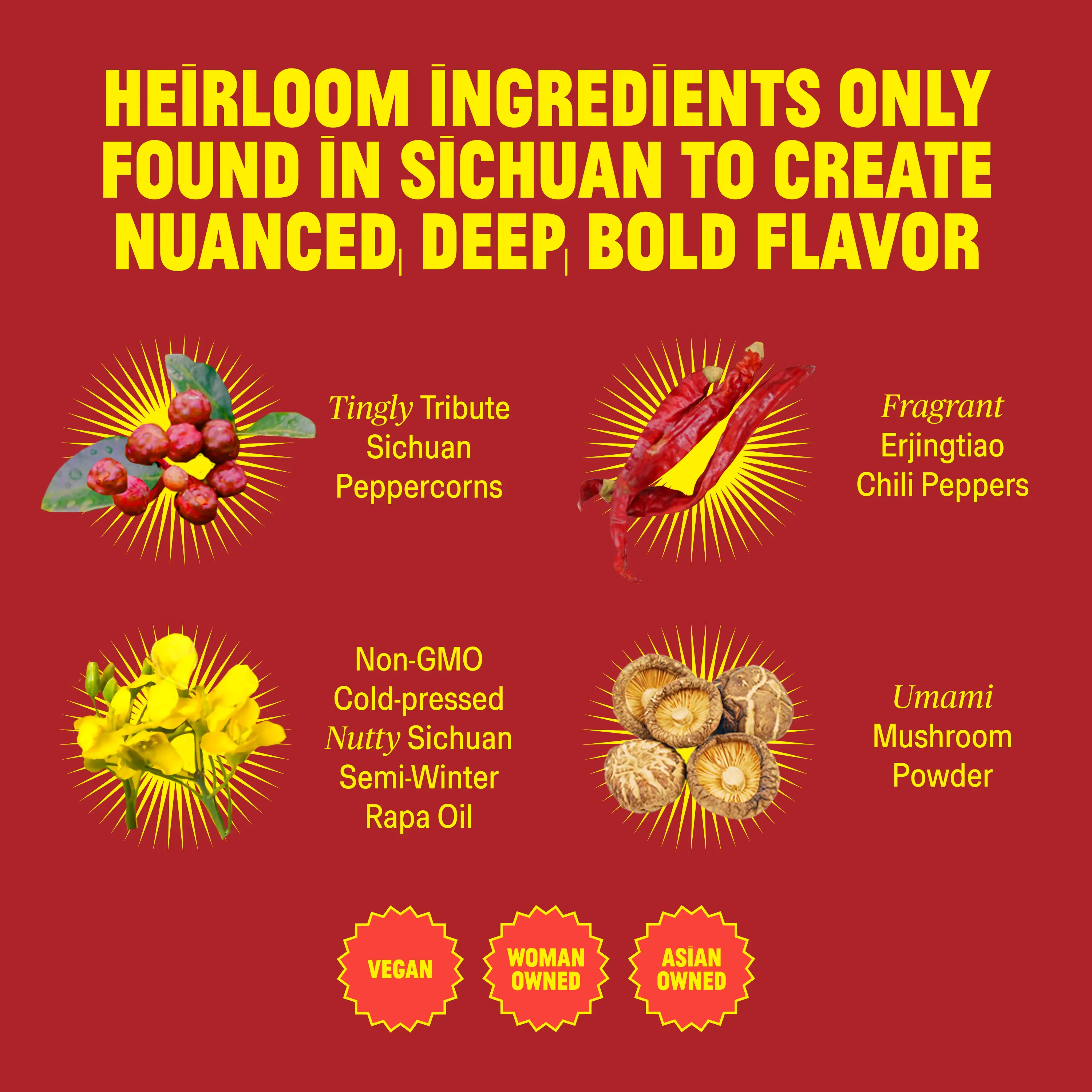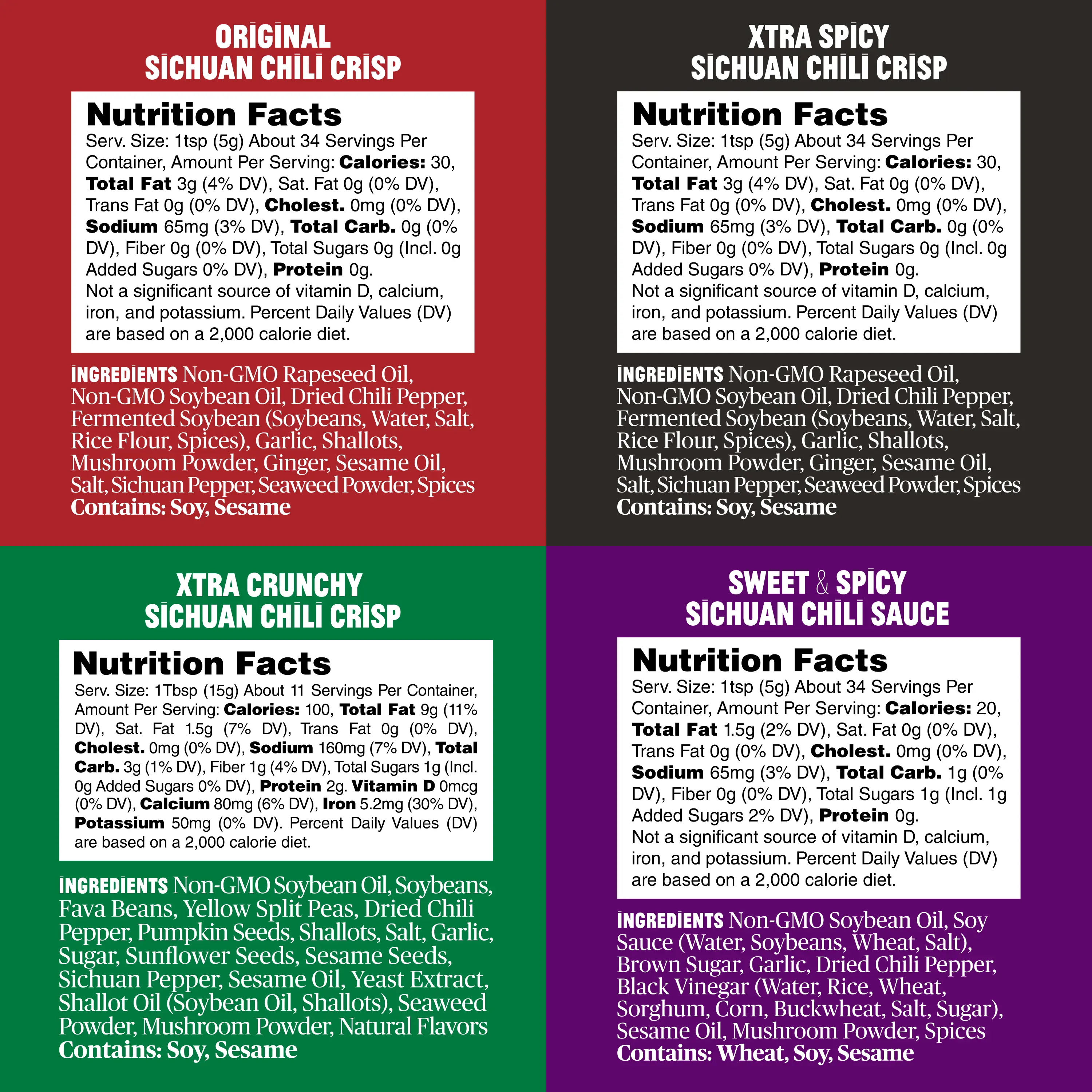 | Ingredients | Non-GMO Rapeseed Oil,Non-GMO Soybean Oil,Dried Chili Pepper,Fermented Soybean,Garlic,Shallots,Mushroom Powder,Ginger,Sesame Oil,Salt,Sichuan Pepper,Seaweed Powder,Spices,Soy Sauce,Brown Sugar,Black Vinegar,Soybeans,Fava Beans,Yellow Split Peas,Pumpkin Seeds,Sugar,Sunflower Seeds,Sesame Seeds,Yeast Extract,Shallot Oil,Natural Flavors,Sichuan Chili Crisp (Non-GMO Rapeseed oil, Non-GMO Soybean oil, Dried Chili Pepper, Fermented Black Bean, Garlic, Sesame Oil, Salt, Shallots, Mushroom Powder, Ginger, Seaweed, Sichuan Pepper, Spices), Zhong Sauce (Non-GMO Rapeseed Oil, Non-GMO Soybean Oil, Soy Sauce, Dried Chili Pepper, Garlic, Sesame Oil, Brown Sugar, Mushroom Powder, Spices), Mala Spice Mix (Dried Chili Pepper, Sugar, Salt, Mushroom Powder, Seaweed Powder, Spices) |