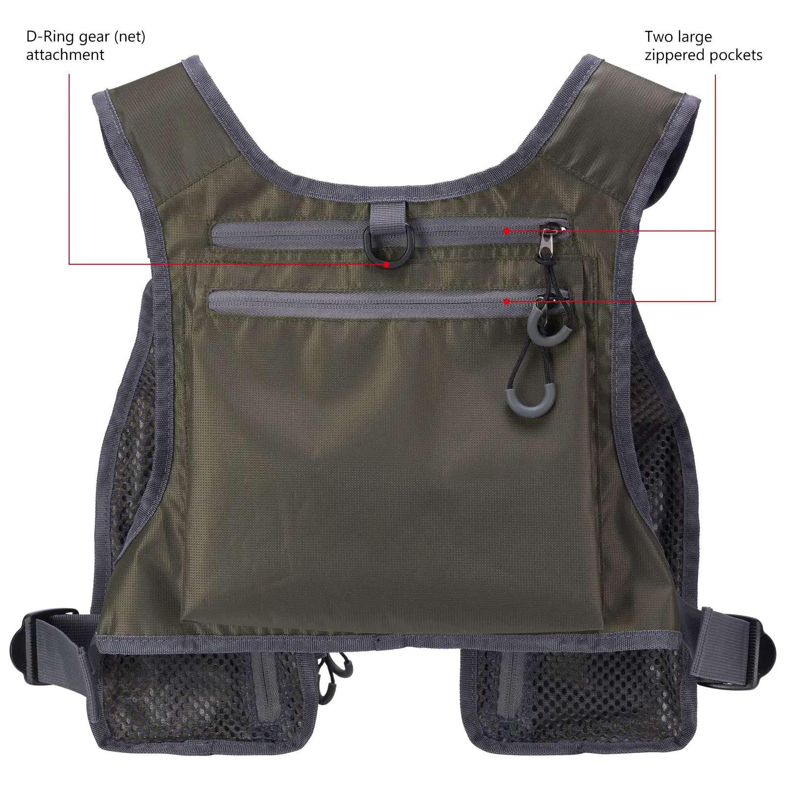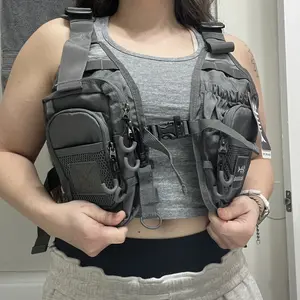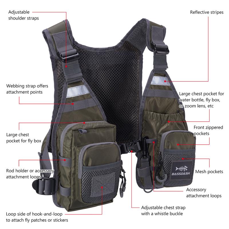 Other features include reflective stripes, loop side of hook-and-loop to attach fly patches or stickers, molle web gear lash, rod holder or accessory attachment loops, D-ring on the back to attach a fishing net, and holder for floatants or sinkants