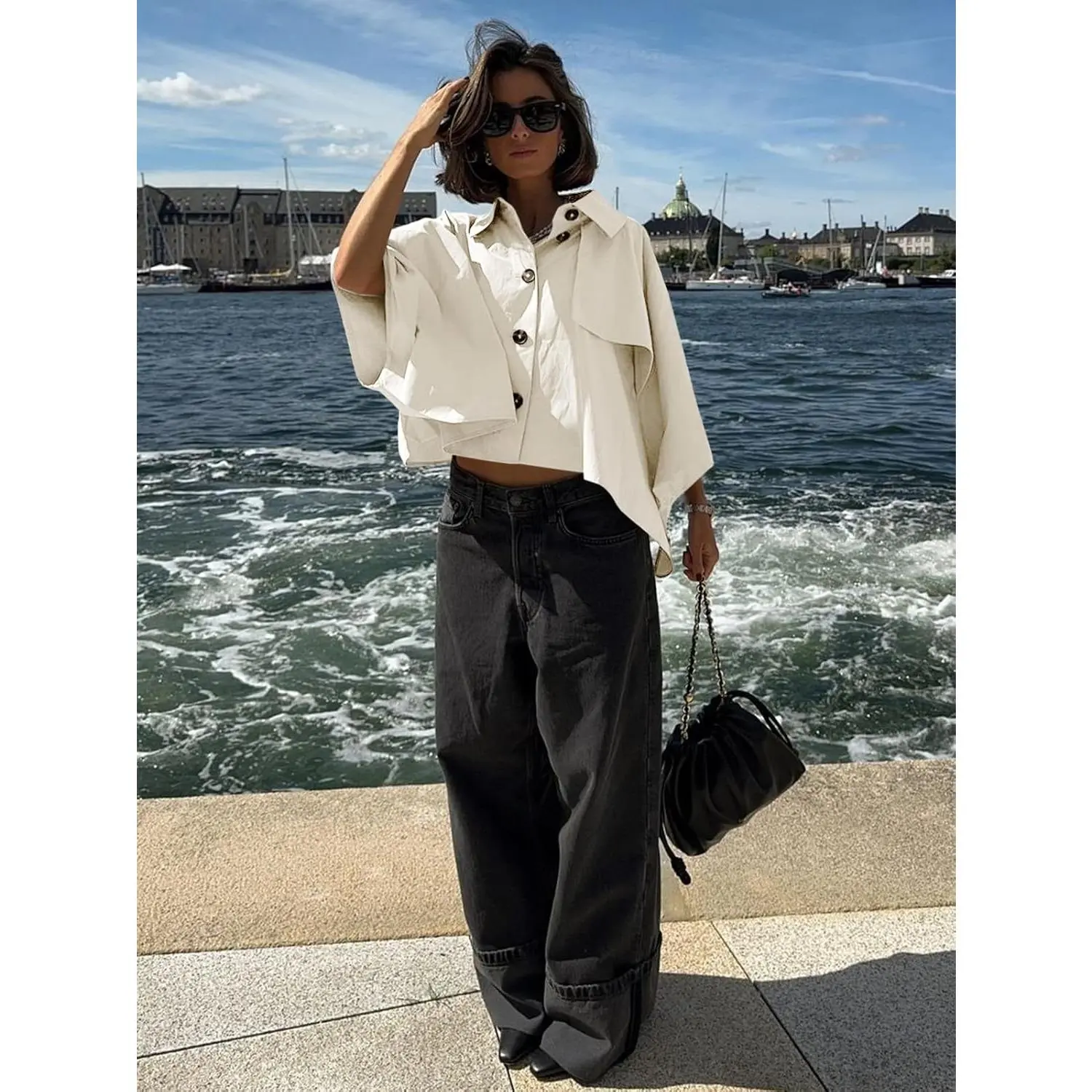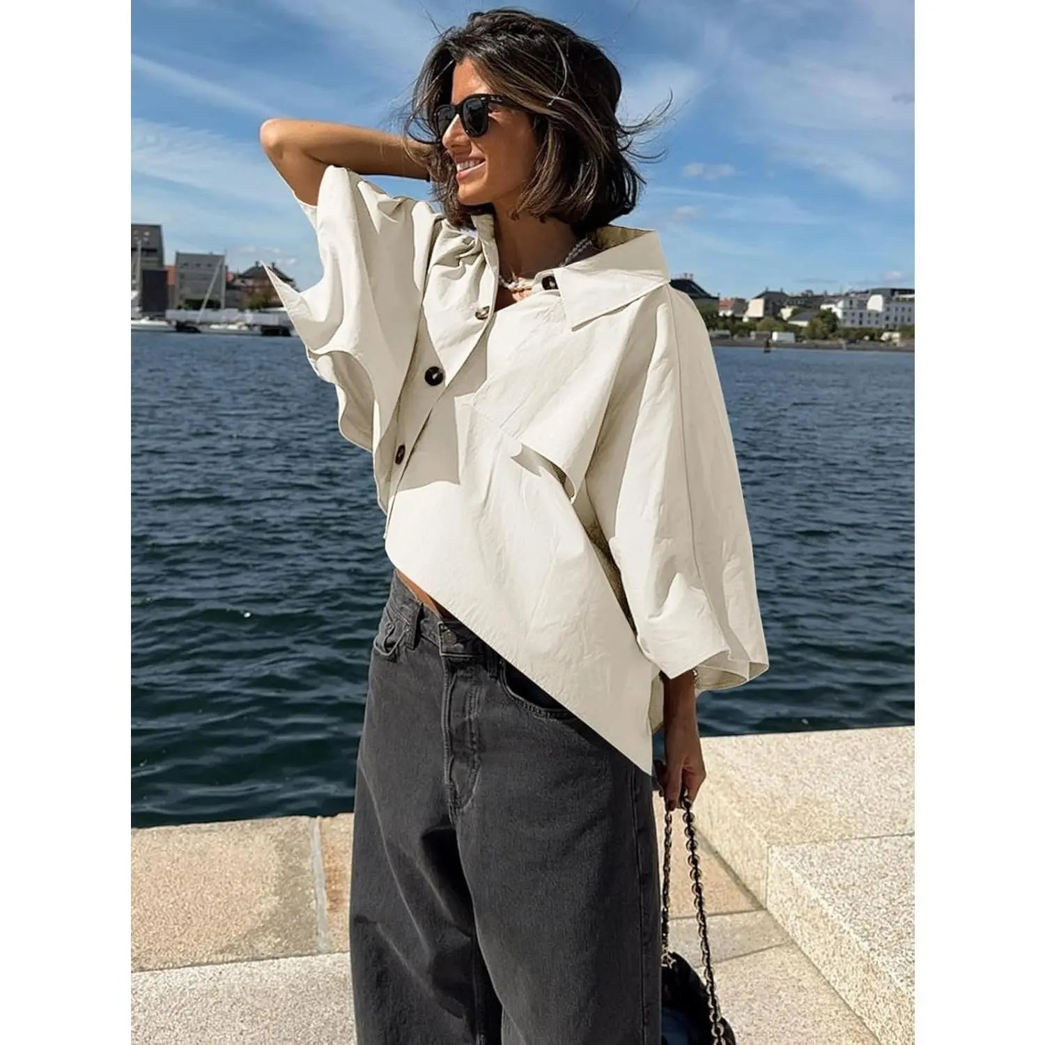 Womens Oversized Cropped Trench Single Breasted 3/4 Cape Sleeve Trendy Casual Jackets Button up Outerwear