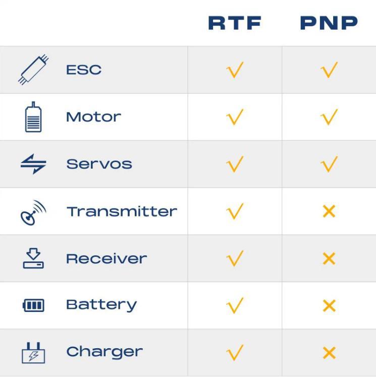 PNP (Plug-and-Play) airplanes include the ESC, motor, and servos all pre-installed from the factory. Transmitter, receiver, battery, and charger are not included.