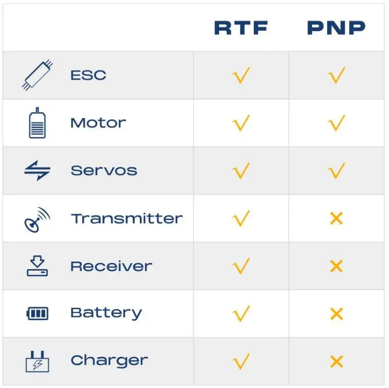 PNP (Plug-and-Play) airplanes include the ESC, motor, and servos all pre-installed from the factory. Transmitter, receiver, battery, and charger are not included.