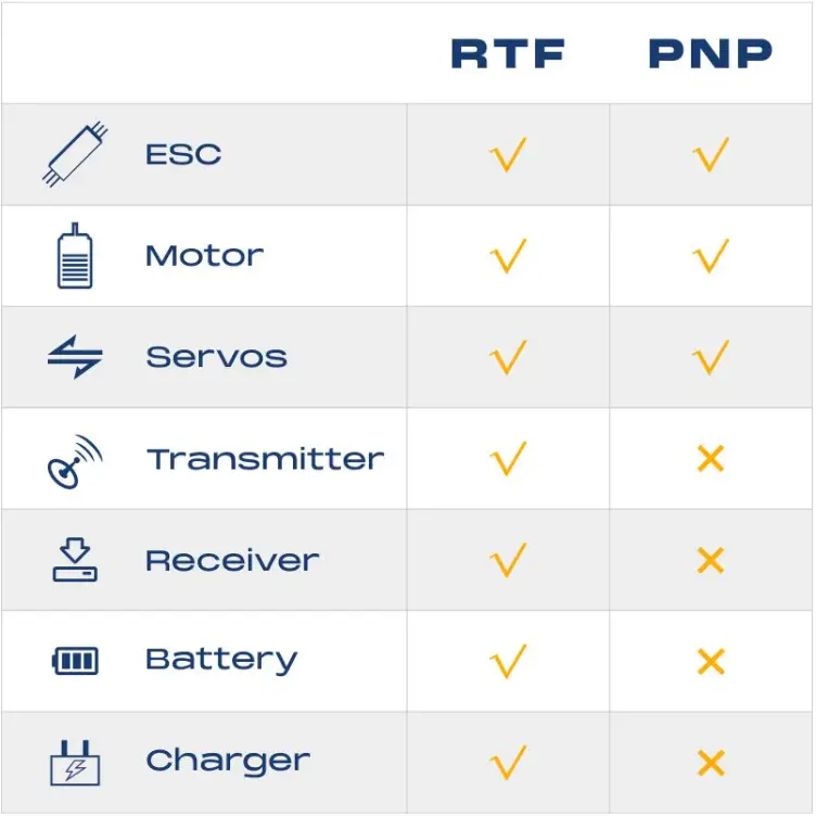 PNP (Plug-and-Play) airplanes include the ESC, motor, and servos all pre-installed from the factory. Transmitter, receiver, battery, and charger are not included.