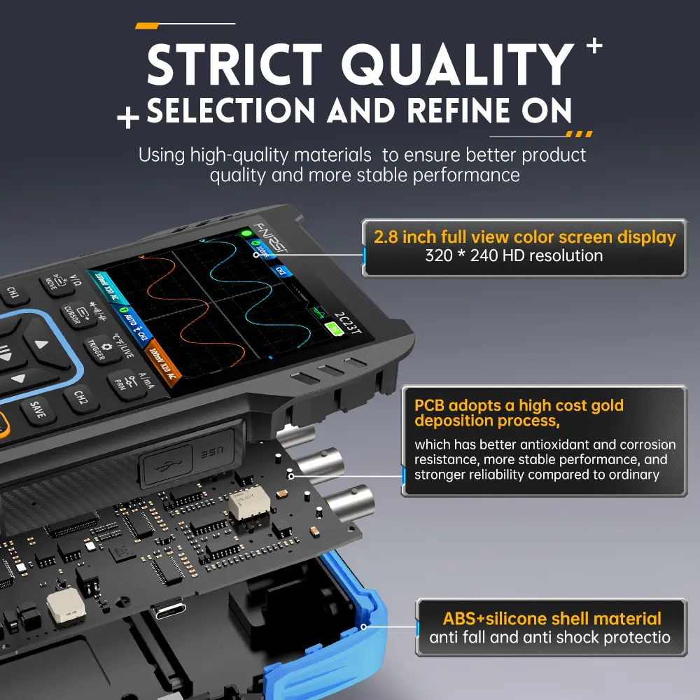 ✦ Excellent Design: The Oscilloscope adopts FPGA + MCU + ADC hardware architecture, built-in high-voltage protection module, adopts 2.8 inch LCD display, built-in 3000mAh Li-ion battery, standby time up to 6H, Type-C interface supports 5V/1A charging.