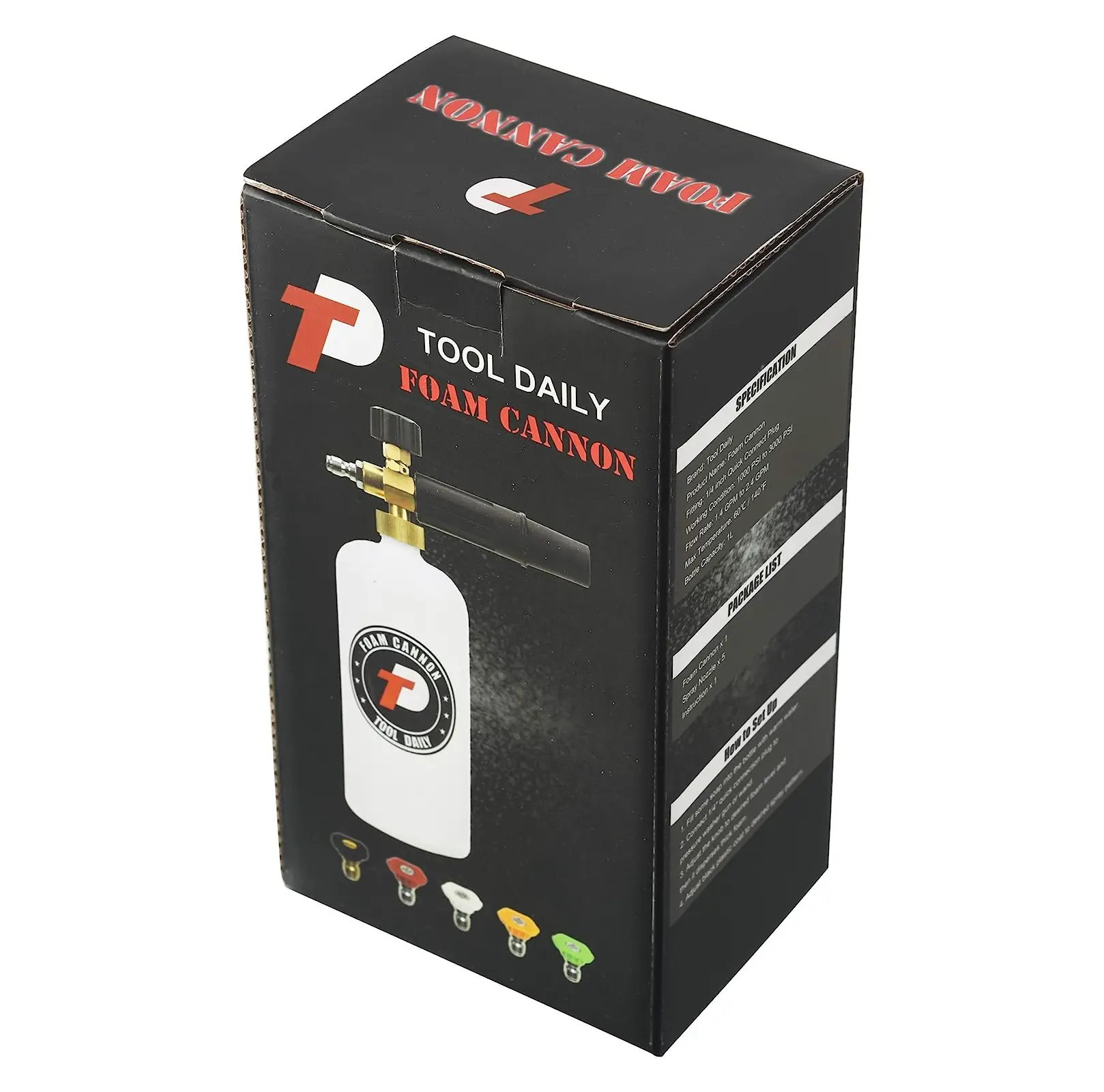 ·Adjustable Snow Foam Lance with 1/4" quick connection fitting. Container Capacity: 1 Liter / 0.22 Gallon. Specification: 1000 PSI to 3000 PSI.