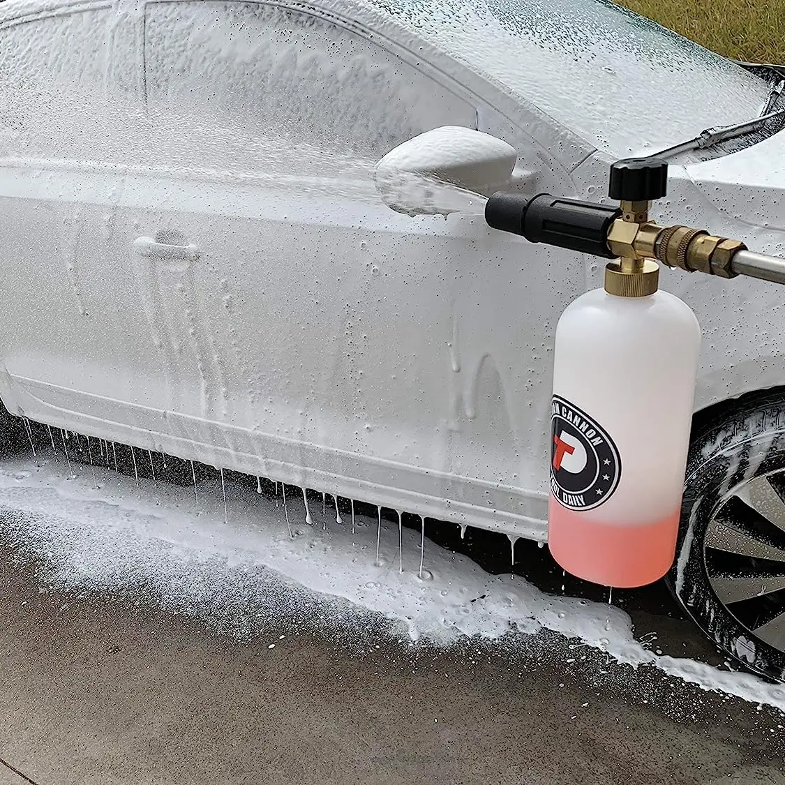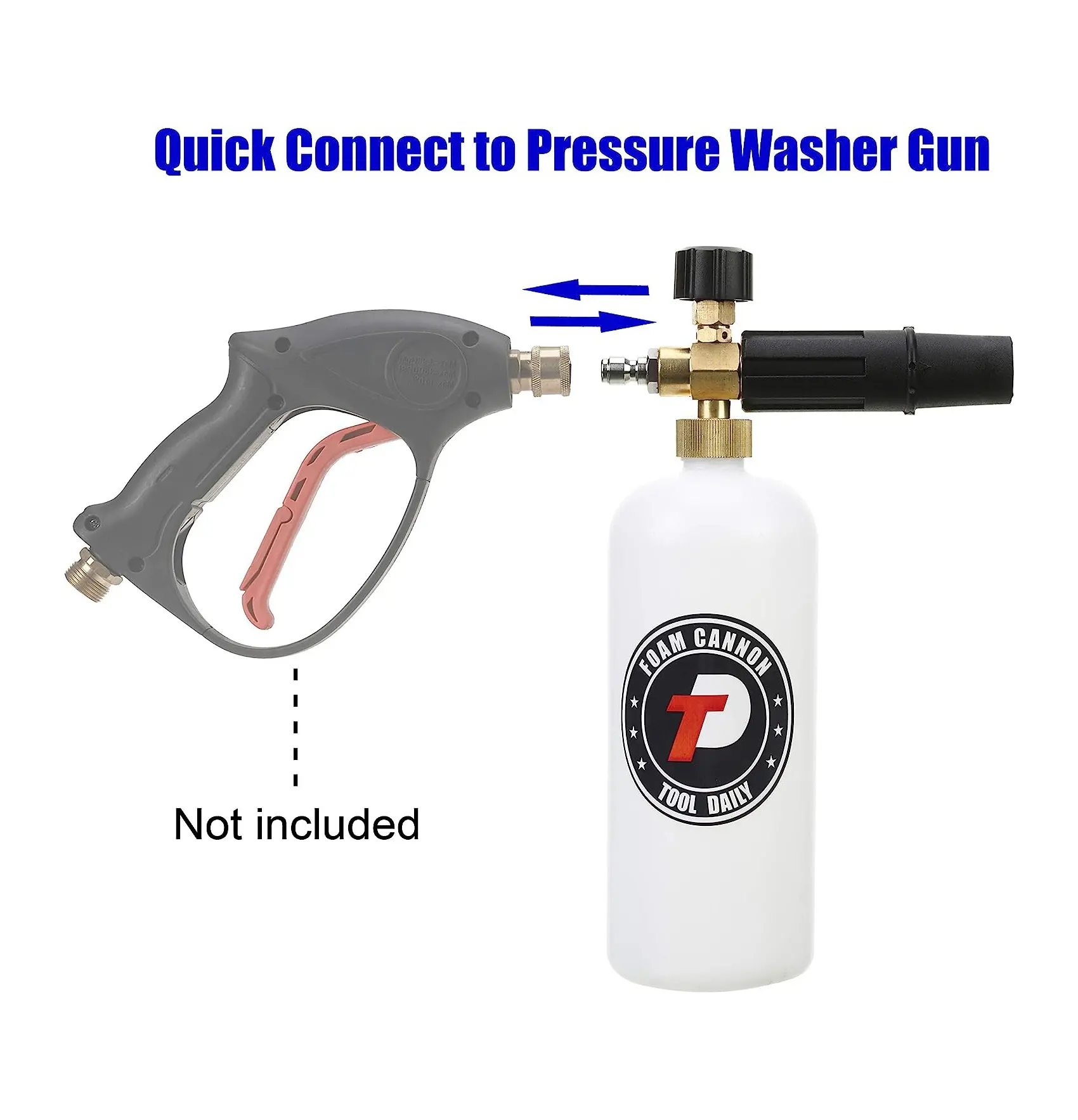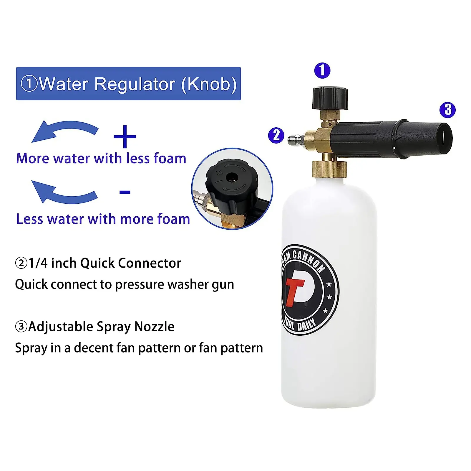 ·EASY to install: fill some soap into the bottle with warm water to get thick foam; Then connect 1/4" quick connection plug to Pressure Washer Spray Lance or Wand. Finally, adjust the knob on the top to desired foam level and then foam sprayer will disperse thick foam. The knob adjusts the foam dispensing amount and the nozzle adjusts the sprinkle pattern.