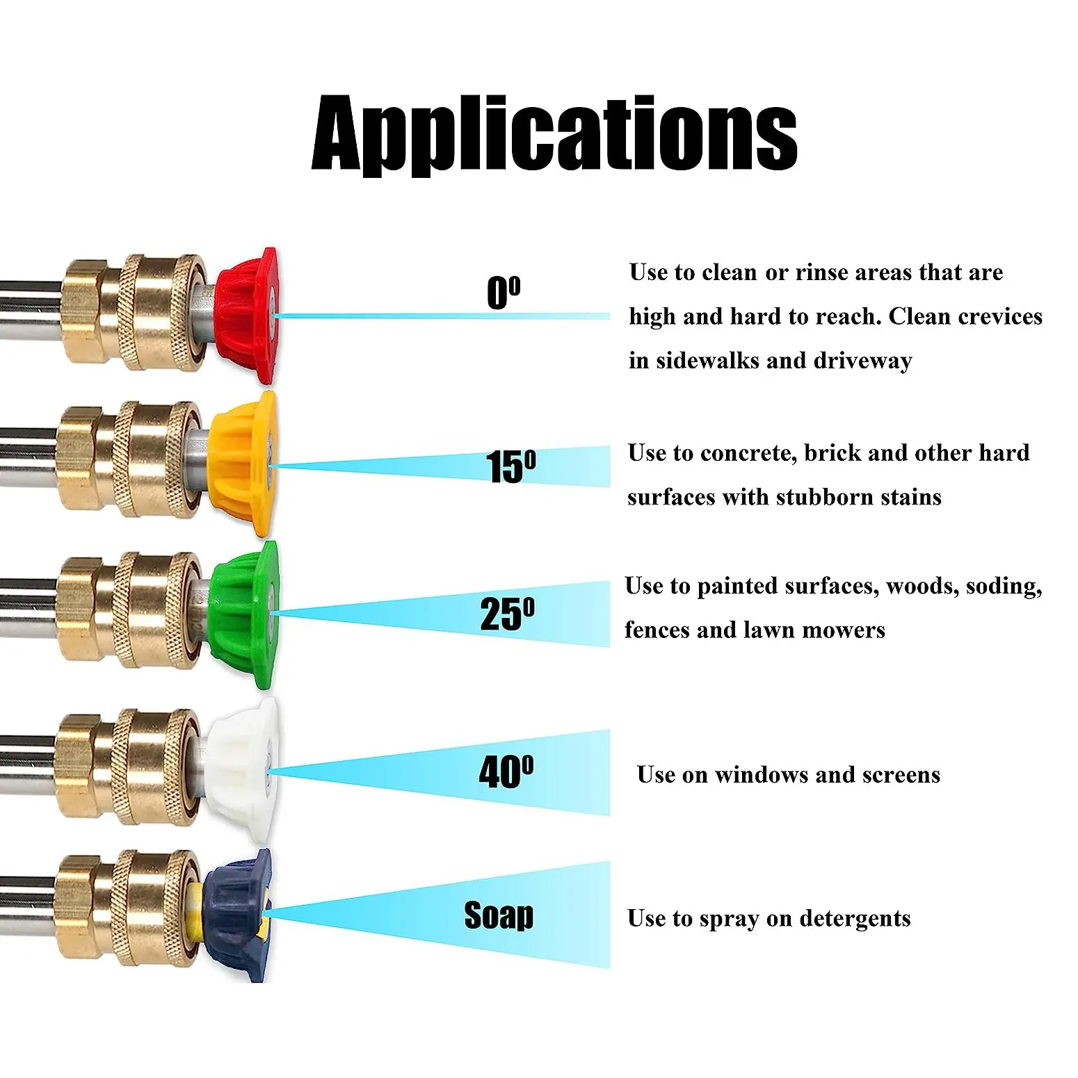 ·5 Nozzle Tips have different angle (0, 15, 25, 40, 65 degree). Choose different nozzle according to the actual need. Such as watering flowers and plants, washing car. They also can be attached to a Quick-Connect Wand for swifter application and more.