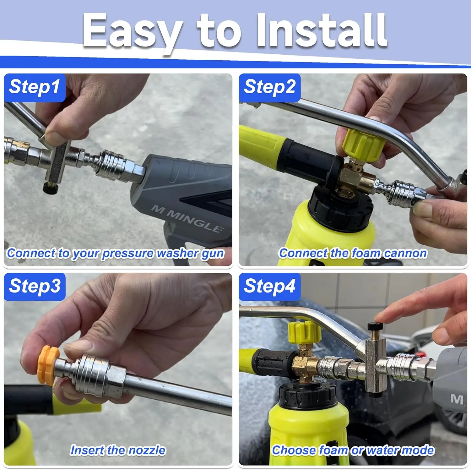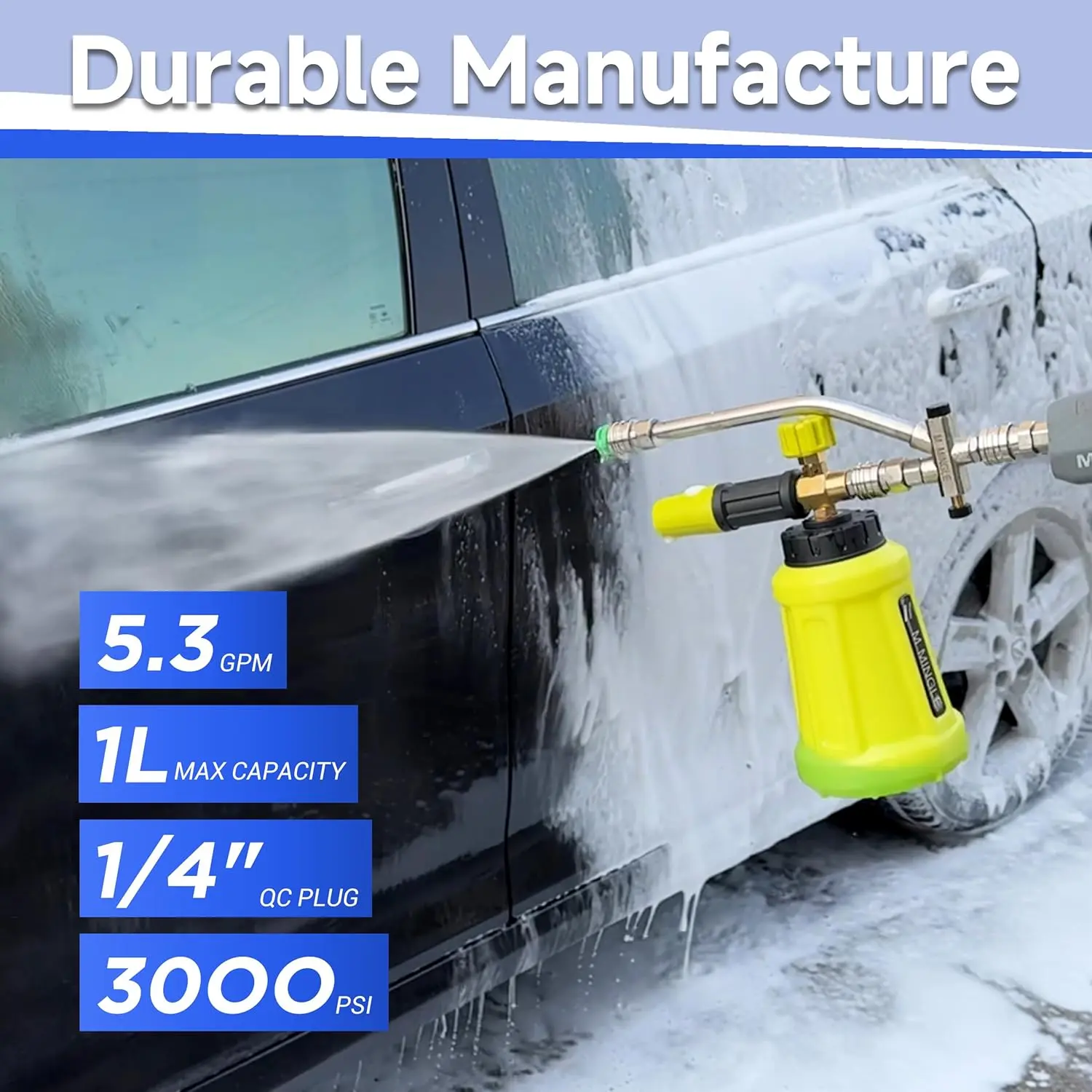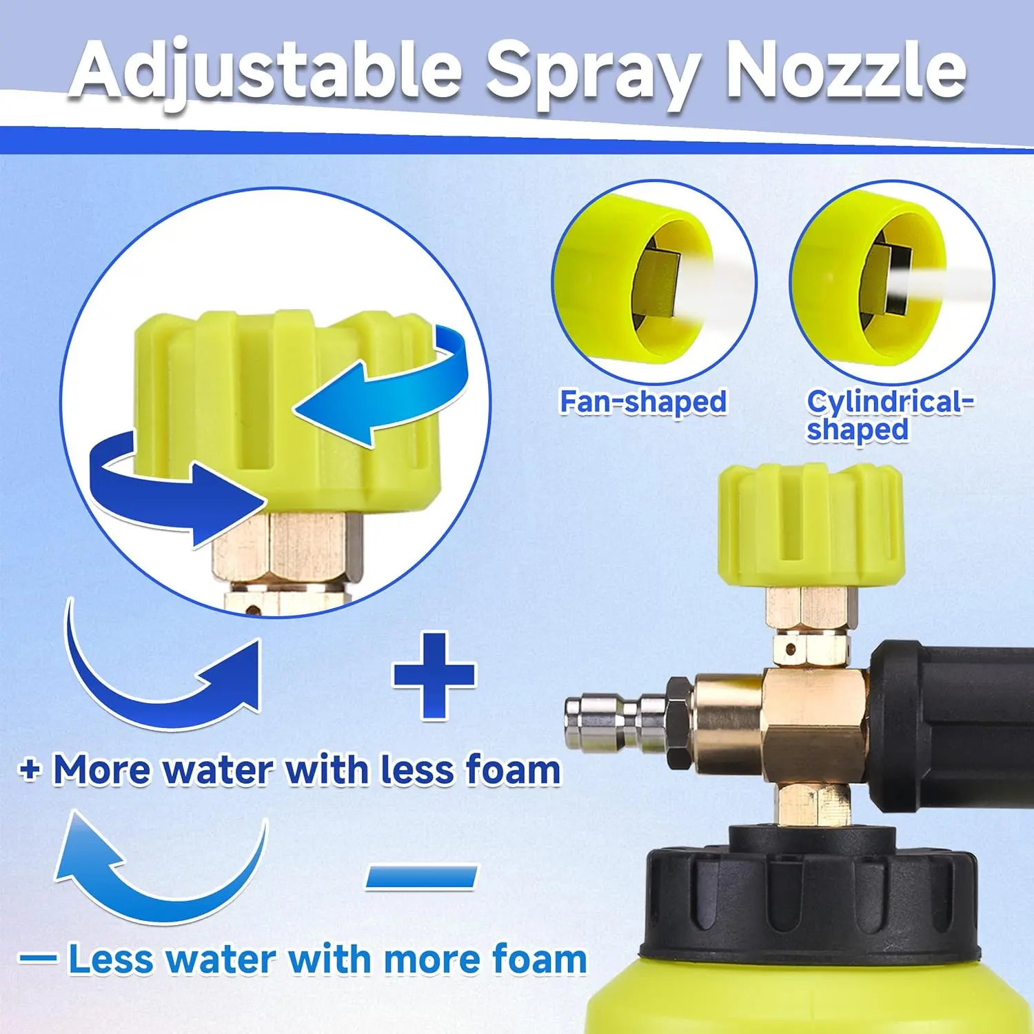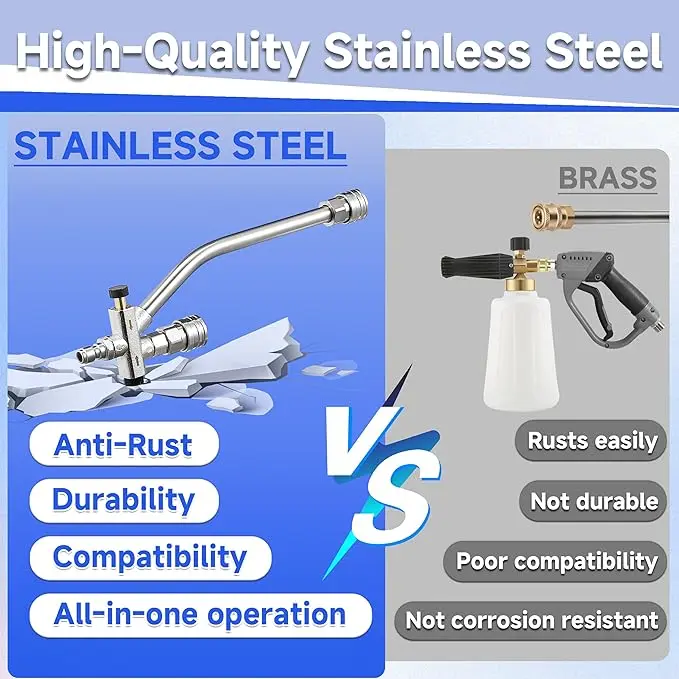 🛠️ Durable Materials: Crafted from premium brass, stainless steel, and high-strength plastics, this foam cannon resists high temperatures and pressure. It ensures long-lasting durability and reliable performance, making it a durable choice for all your cleaning needs.
