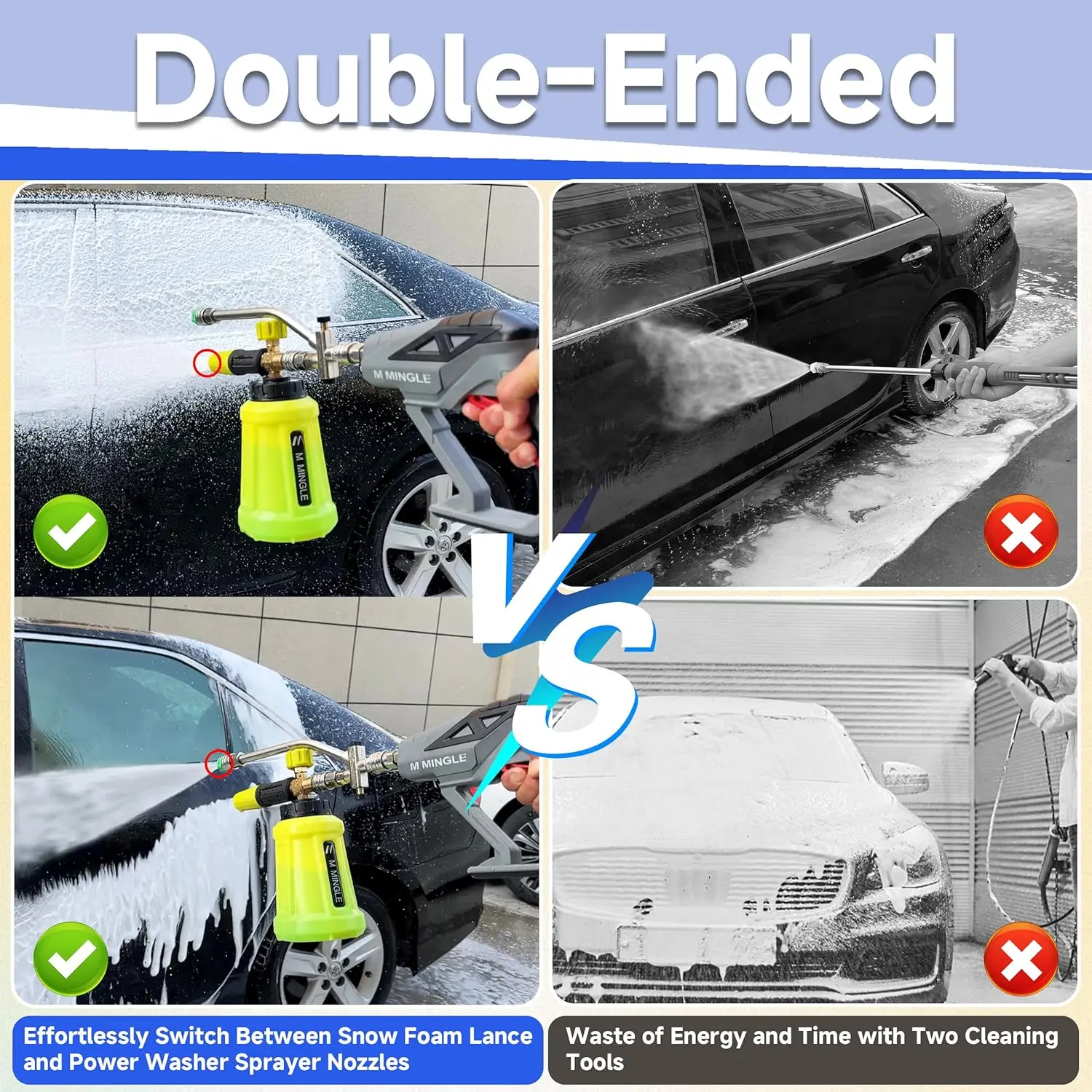 🔧 Dual-Connector Accessory: With a unique dual-head connector and a two-way valve, this accessory allows seamless switching between foam and water modes. Effortlessly transition between foam and water without constant nozzle changes, saving time and effort.
