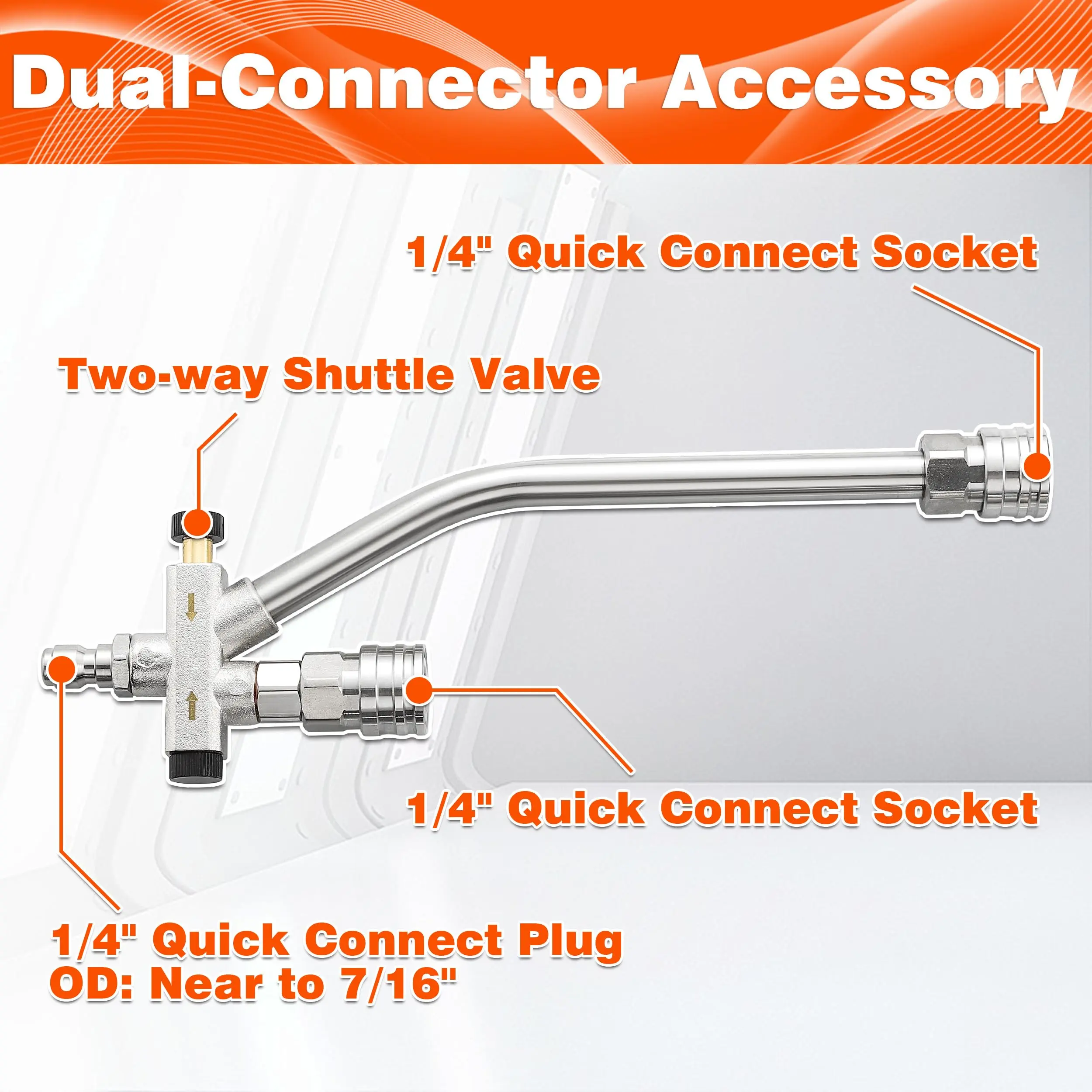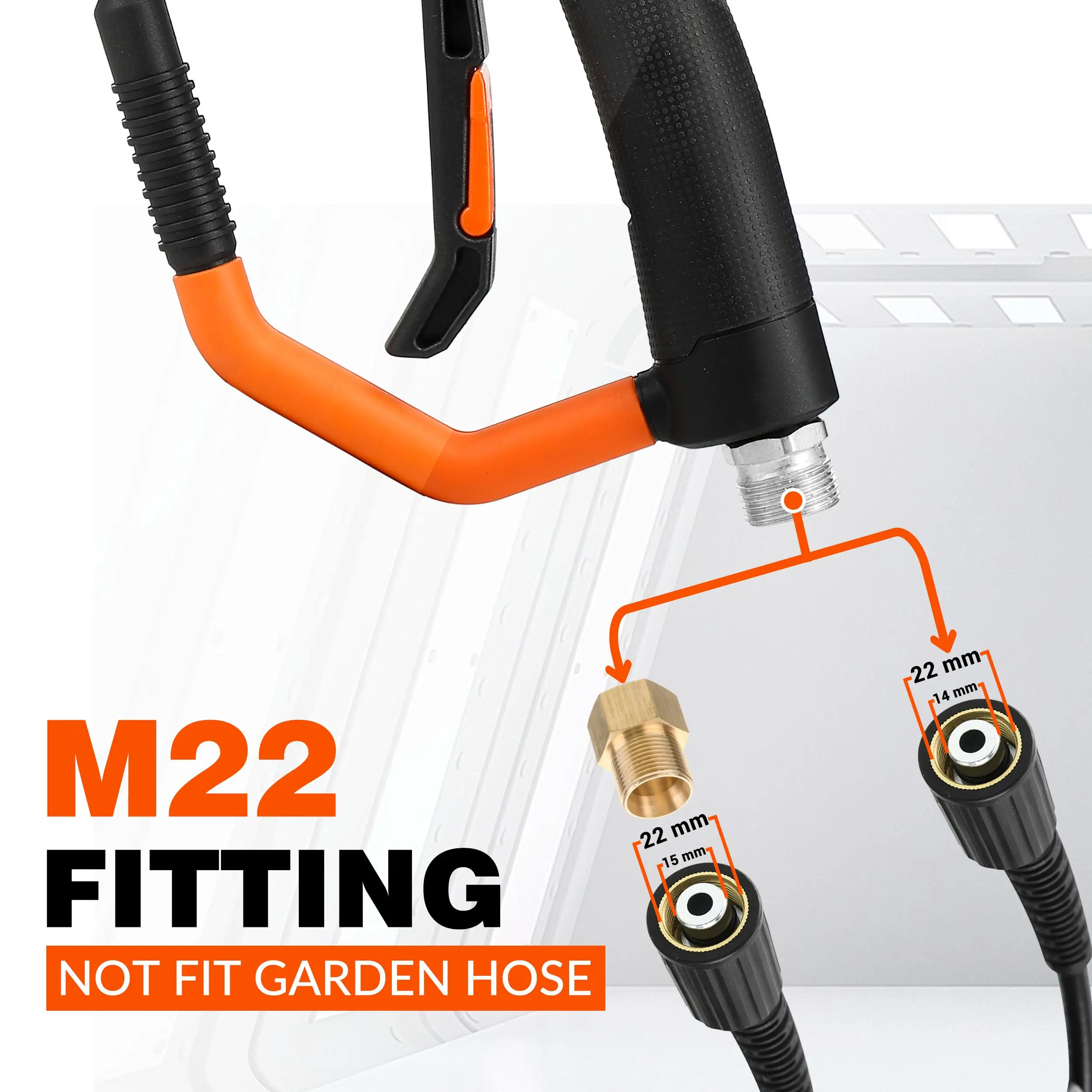 Equipped with an M22 connector compatible with both M22 14mm and M22 15mm fittings. Also supports 3/8'' quick connect adapters, making it easy to connect with most pressure washer hoses.