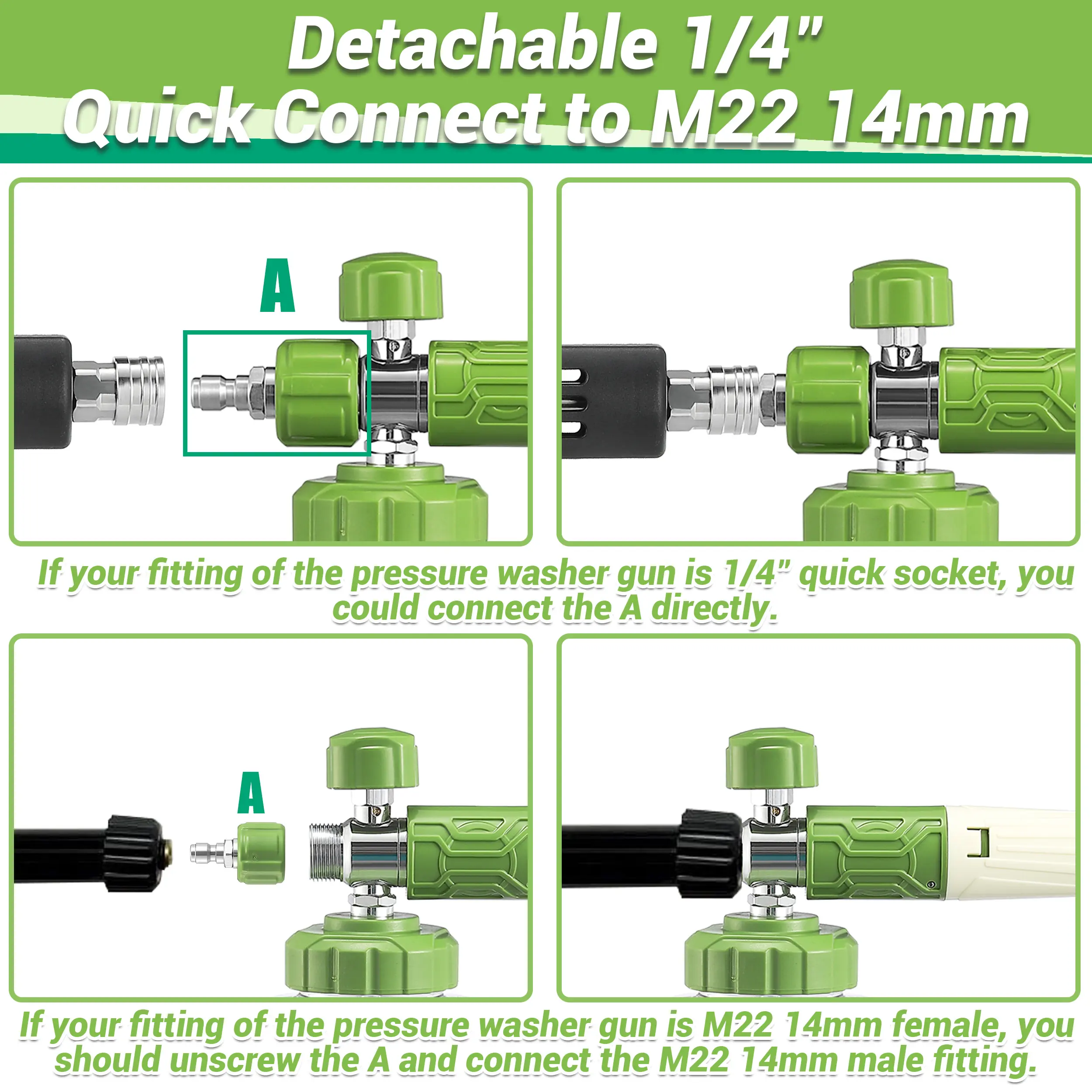 ¡If your pressure washer wand has a 1/4" quick socket, you can directly connect the 1/4" Quick Connector of the foam cannon. It offers a quick-connect feature for easy and secure attachment to pressure washers.