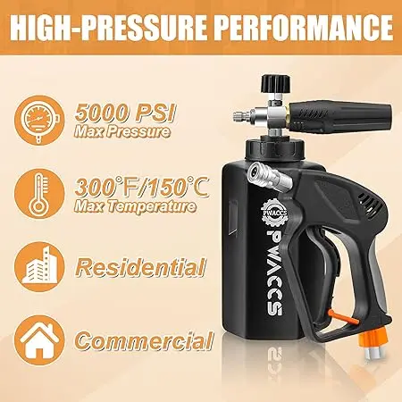 ·MATERIAL UPGRADE - Pressure washer car wash kit is made of high-quality stainless steel and silicone material, which is strong and durable, and can work at MAX 5000 PSI normally, Max temperature for water is up to 150℃ ( 300℉). The wide neck foam blaster is equipped with a stainless steel filter, which ensures a leak-proof seal.