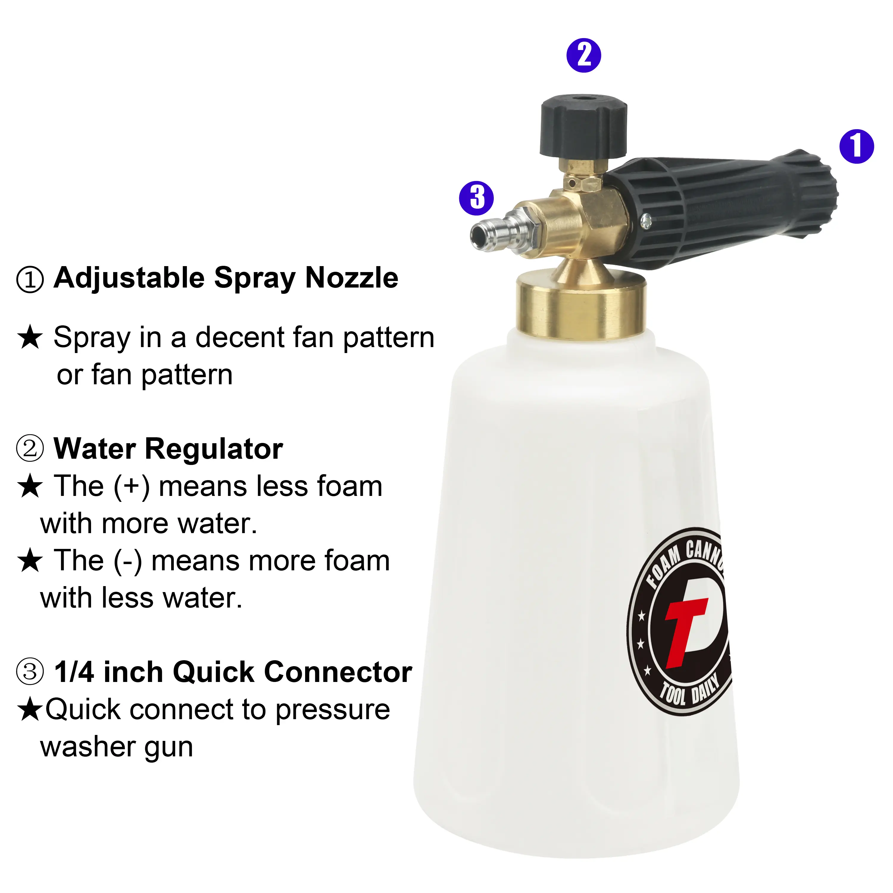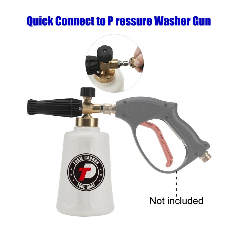 ·Tools Daily 1/4" Quick Disconnect Foam Cannon with white container bottle and 1.1mm extra nozzle for foam sprayer. The container bottle has a larger mouth for easy filling and a wider neck to prevent cracking problems.