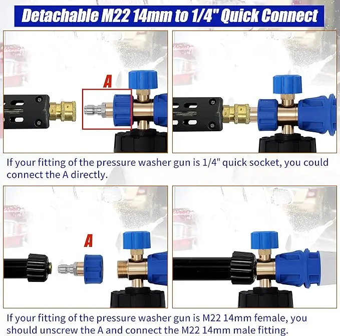 ·EASY CONNECTION: Our snow foam cannon offers versatile connection options. You can connect it to a pressure washer spray lance using the detachable 1/4" quick connector. Simply remove the 1/4" quick connector to connect the foam cannon directly to a pressure washer spray lance with M22 14mm threads.