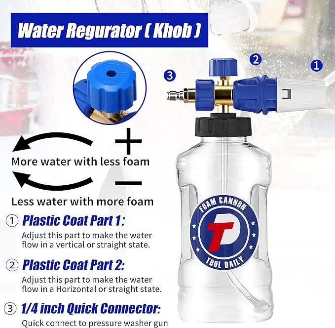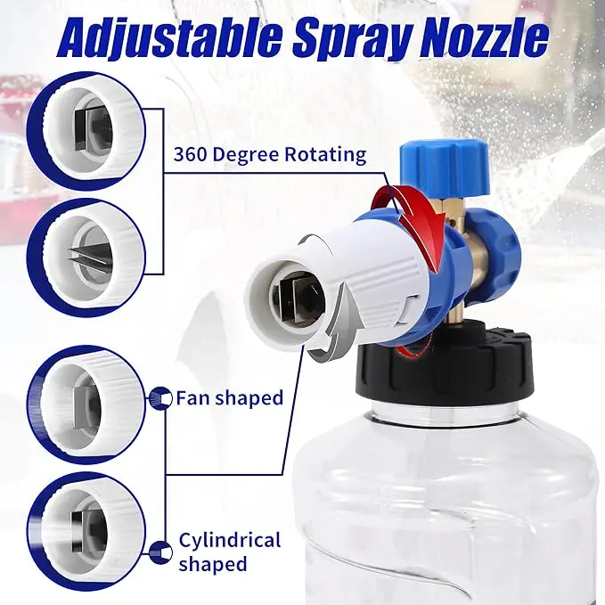 ·EASY TO INSTALL: First, fill the foam bottle with soap and warm water to create thick foam. Then, attach the cannon to your power washer spray lance or wand. Finally, adjust the knob on top to control the foam level and the nozzle to adjust the spray pattern. The knob allows you to adjust the amount of foam dispensed, while the nozzle controls the pattern of the spray. With our foam cannon, you can easily achieve thick foam for effective cleaning.