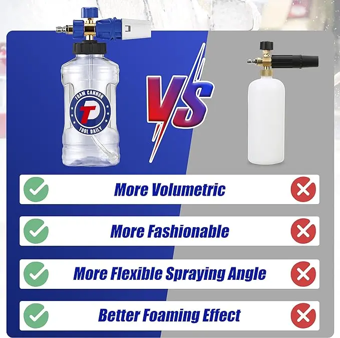 ·UPGRADED FEATURES: Our foam cannons’ working pressure is 1000 psi to 3600 psi. The container bottle features a larger mouth for easy filling and an extra-wide neck to prevent cracking and leaking. The foam sprayer comes with a 1/4” fitting and has a container capacity of 1.5 Liters / 0.33 Gallons. With a larger capacity foam cannon, you can clean for longer periods of time and tackle larger cleaning jobs.