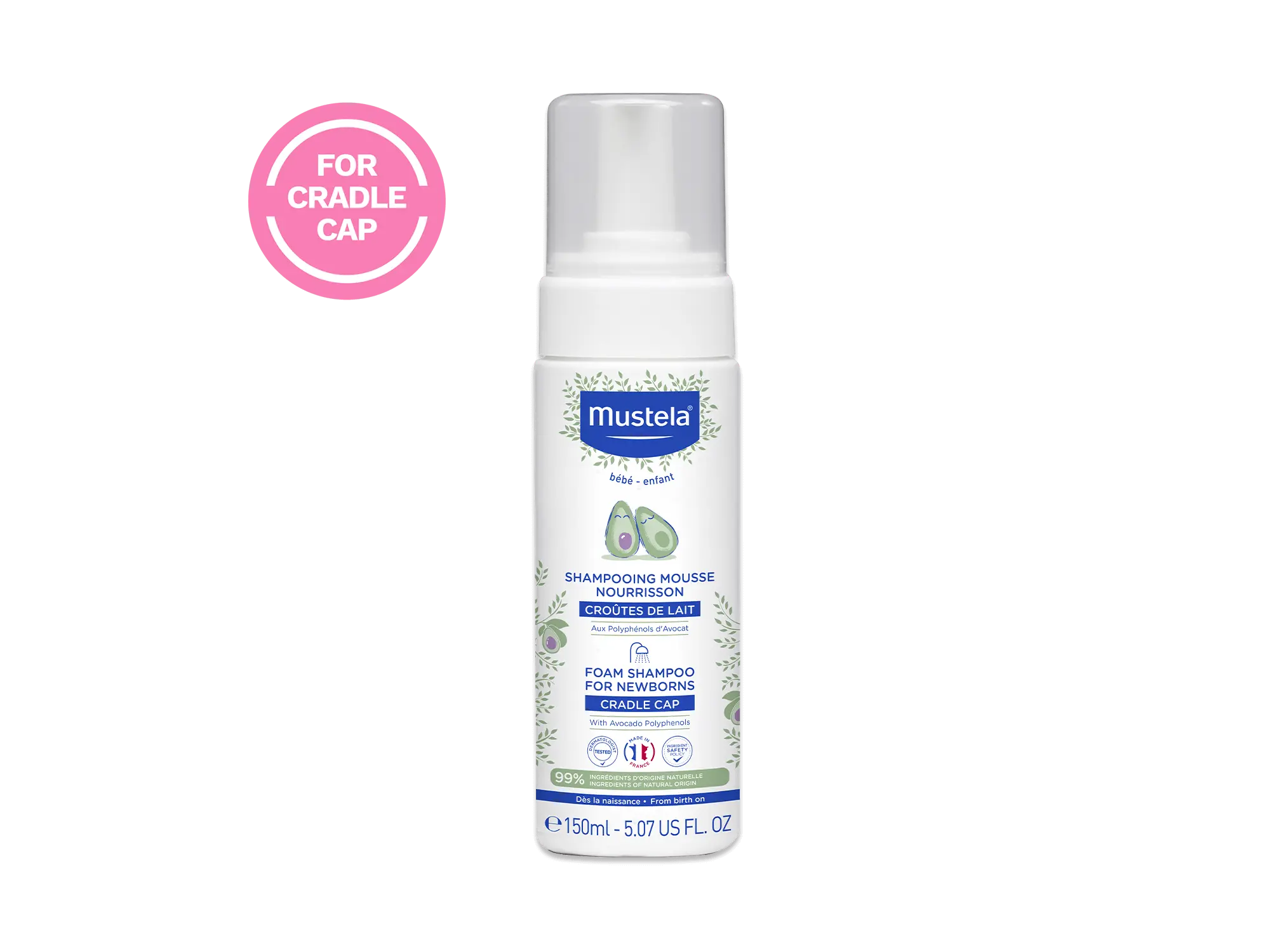 Mustela's Foam shampoo for newborns is designed to clean baby's hair and scalp while minimizing cradle cap. It gently exfoliates and rinses away flakes while helping to reduce the chance of recurrence. This tear-free, fragrance-free, foaming cradle cap shampoo rinses off easily, allowing for safe use on the forehead and eyebrow area. Made with 99% ingredients of natural origin per ISO 16128 standard, including Avocado Polyphenols, Sunflower Seed Oil, and a patented blend of rebalancing ingredients, this powerful yet gentle formula is effective for addressing cradle cap.