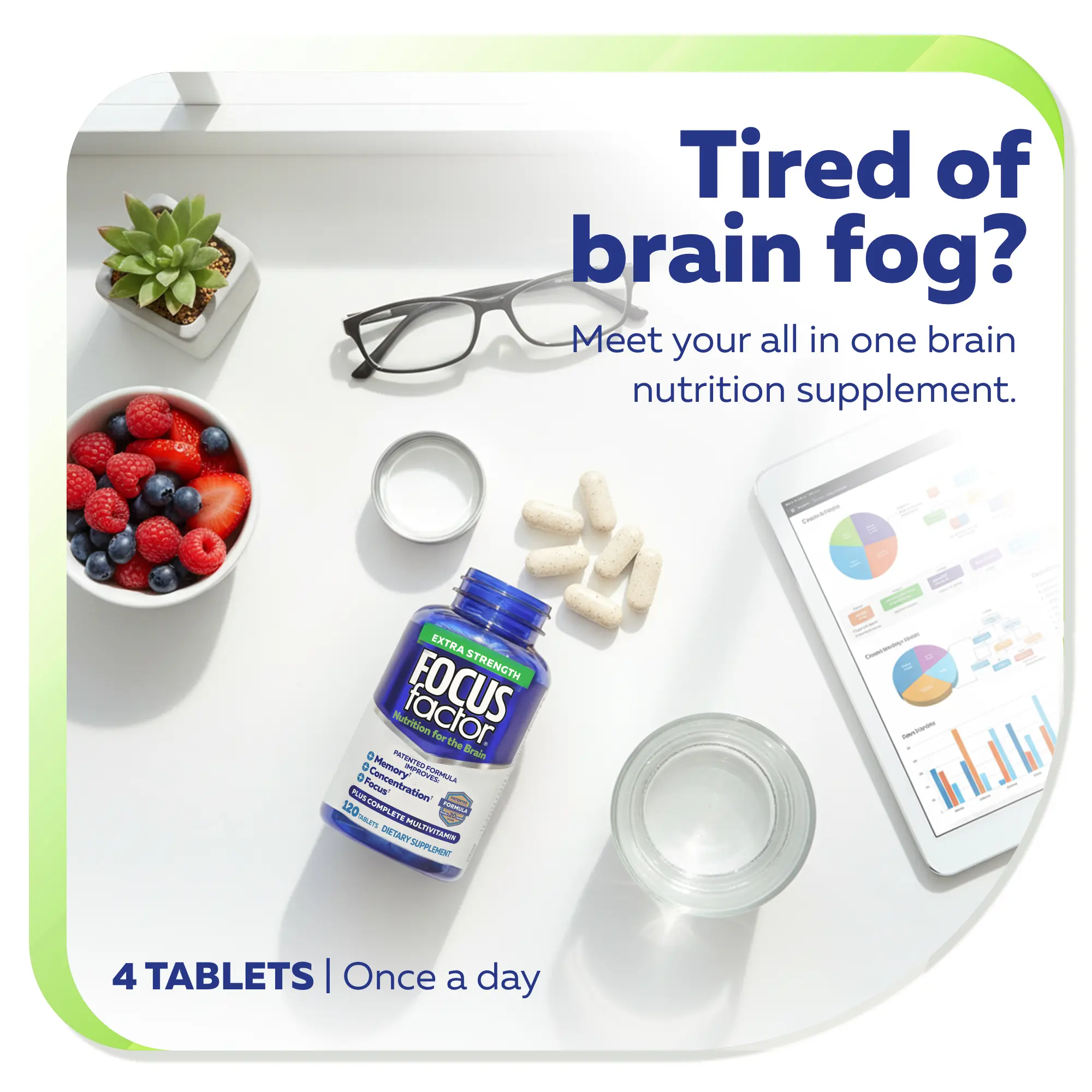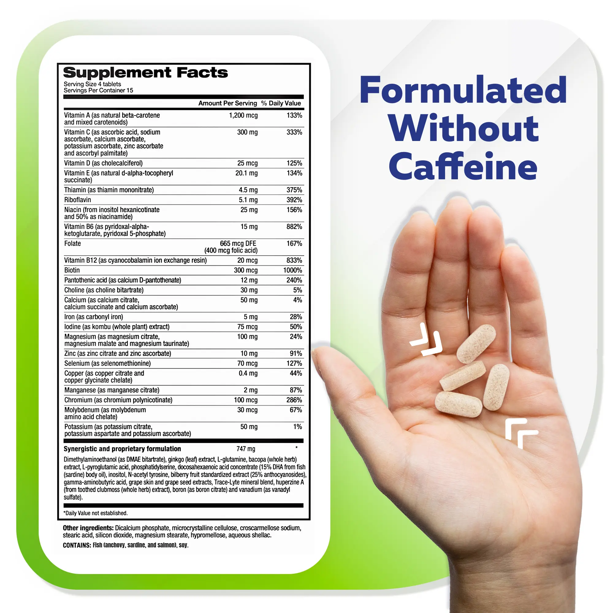 | Ingredients | Vitamin A,Vitamin C,Vitamin D,Vitamin E,Thiamin,Riboflavin,Niacin,Vitamin B6,Folate,Vitamin B12,Biotin,Pantothenic acid,Choline,Calcium,Iron,Iodine,Magnesium,Zinc,Selenium,Copper,Manganese,Chromium,Molybdenum,Potassium,Dimethylaminoethanol (as DMAE bitartrate),ginkgo biloba extract (leaf),L-glutamine,bacopa (Bacopa monnieri extract; whole plant),L-pyroglutamic acid,phosphatidylserine,docosahexaenoic acid concentrate (15% DHA from fish (anchovy - sardine - salmon) body oil),inositol,N-acetyl tyrosine,bilberry fruit standardized extract (25% anthocyanosides),gamma-aminobutyric acid,grape skin and grape seed extracts,Trace-Lyte electrolyte concentrate,huperzine A (extract of Huperzia serrata; aerial parts),boron (as boron citrate),vanadium (as vanadyl sulfate),Microcrystalline cellulose,dicalcium phosphate,croscarmellose sodium,vegetable stearic acid,vegetable magnesium stearate,hypromellose,silicon dioxide,polyethylene glycol,food glaze,polysorbate 80 |
