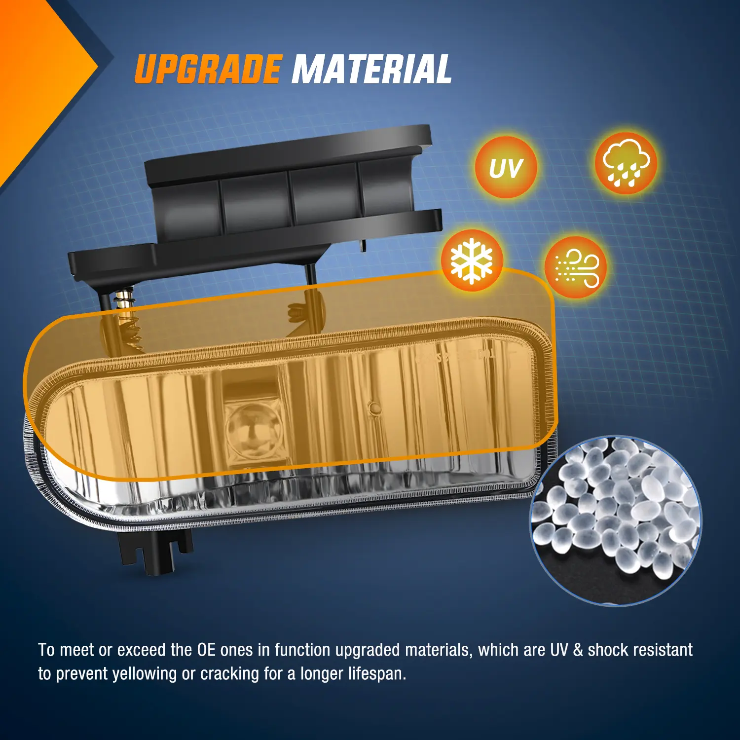 To meet or exceed the OE ones in function upgraded materials, which are UV & shock-resistant to prevent yellowing or cracking for a longer lifespan.