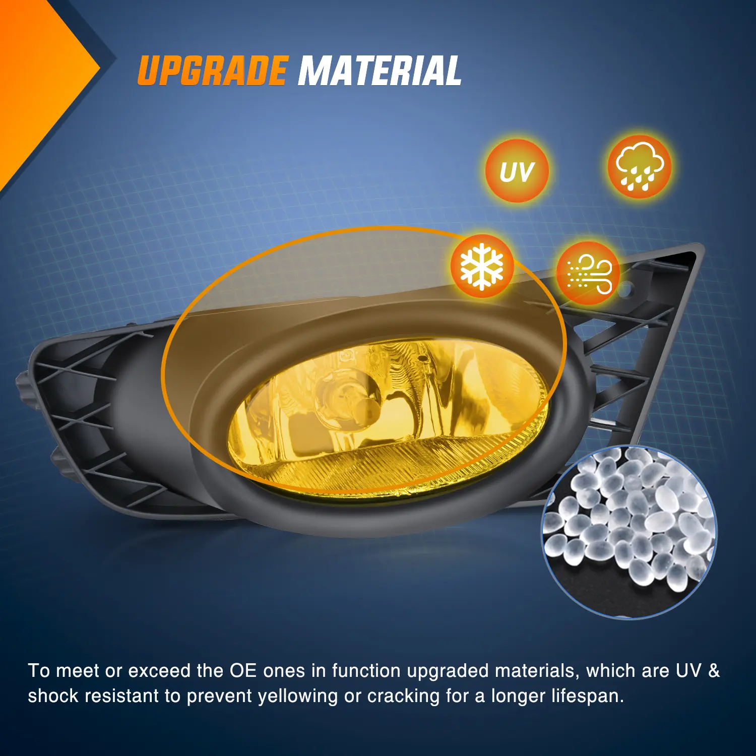 To meet or exceed the OE ones in function upgraded materials, which are UV & shock-resistant to prevent yellowing or cracking for a longer lifespan.