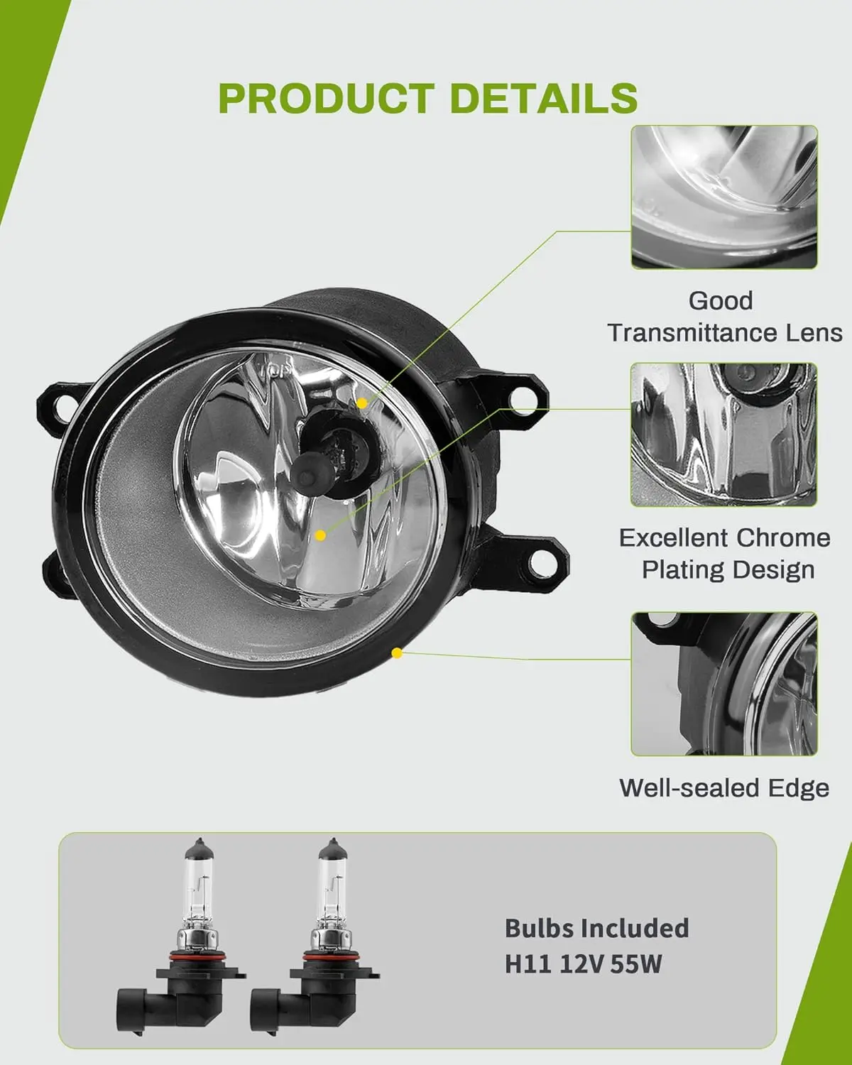 ·Power: Operates at H11 12V 55W, providing efficient illumination for your road.