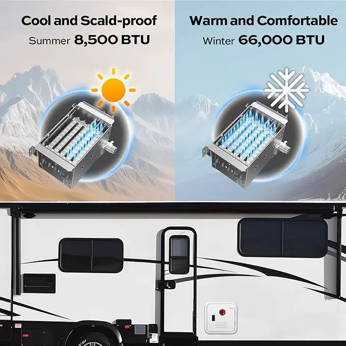 · : The RV tankless water heater delivers instant hot water at 3.6 GPM with precise temperature control within ±1℉. The burner adapts to the season: two rows of flames in summer to prevent overheating, and all five rows in winter to ensure warmth. The mixing tank further stabilizes extreme temperatures