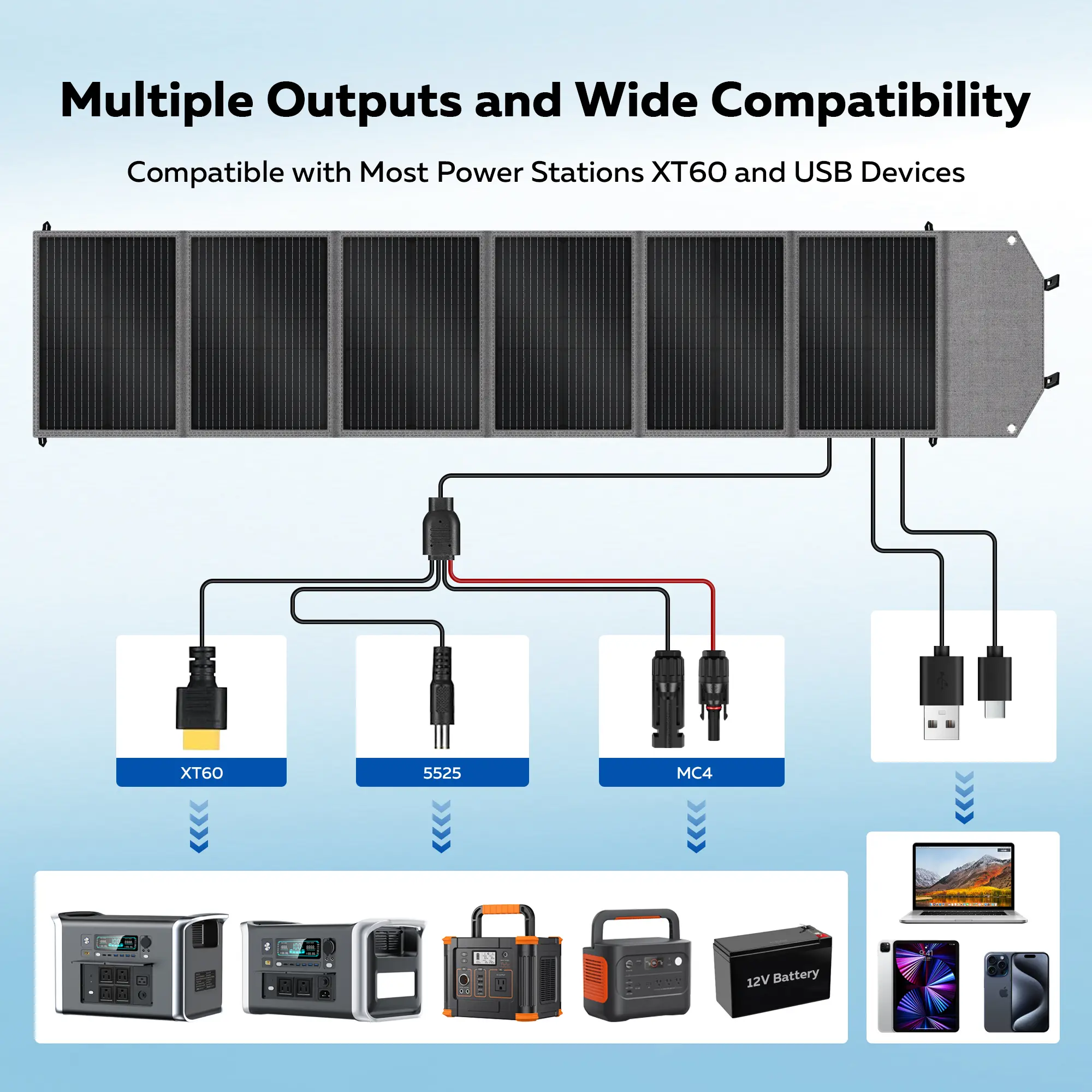 Equipped with MC4 connectors, QC3.0 fast-charging USB, TYPE-C PD, XT60 (PWM buck controller), and standard USB. These ports ensure compatibility with a wide range of devices, meeting diverse charging needs. Stay connected anywhere!