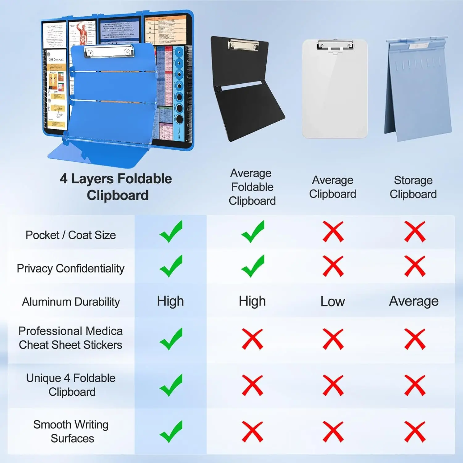 Built-In Cheat Sheets:Our 4 Layers Pocket Size Foldable Clipboards Cheat Charts On The Backside Of The Clipboard Are Specialized Customization, Made Of High-Quality PVC Material And Featured With A Color-Coded, Water-Resistant, Sturdy And Durable, Quickly Access Vital References Includes :Vital Signs, ABG, QRS Complex , BMI Weight Status!