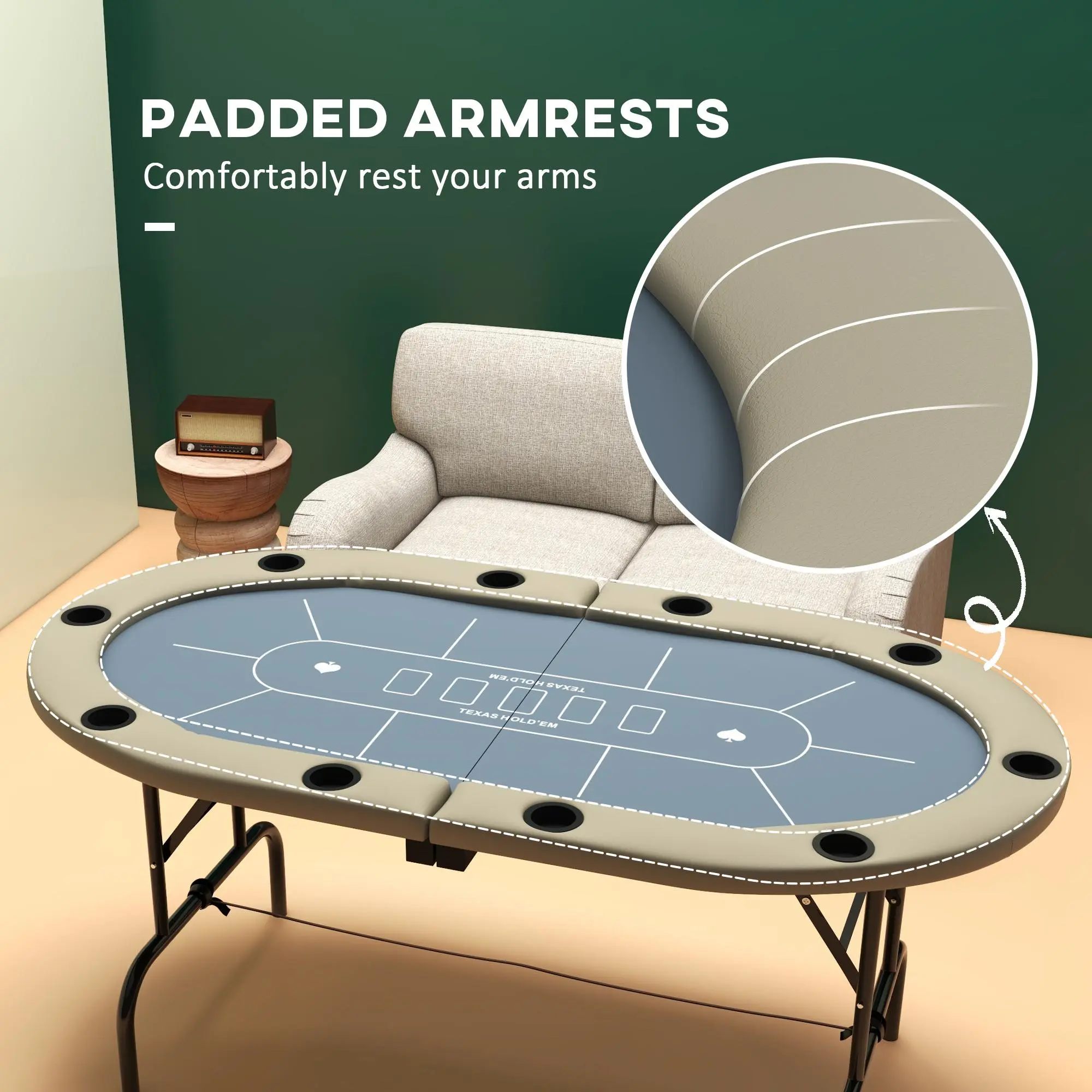 it includes rules and card placement areas. Allowing fun without a mess, our folding poker table comes with ten cup holders to provide players with a convenient place for drinks.Comfy Padded Poker Table: When the game starts, players can lean on the poker table's padded armrest rails to look over their cards. Though a foldable poker table, its strong build offers casino-like quality.Portable and Compact: A simple folding design makes cleaning up and traveling a cinch. This felt poker table quickly folds flat for easy storage in the closet or trunk.Game Table, Portable Folding Poker Table Info: Overall Dimensions: 70" L x 35" W x 27.5" H. Folded Dimensions: 35" L x 35" W x 6.25" D. Cup Holder Dimensions: Dia. 3" x 1.25" H. Weight Capacity: 110 lbs.