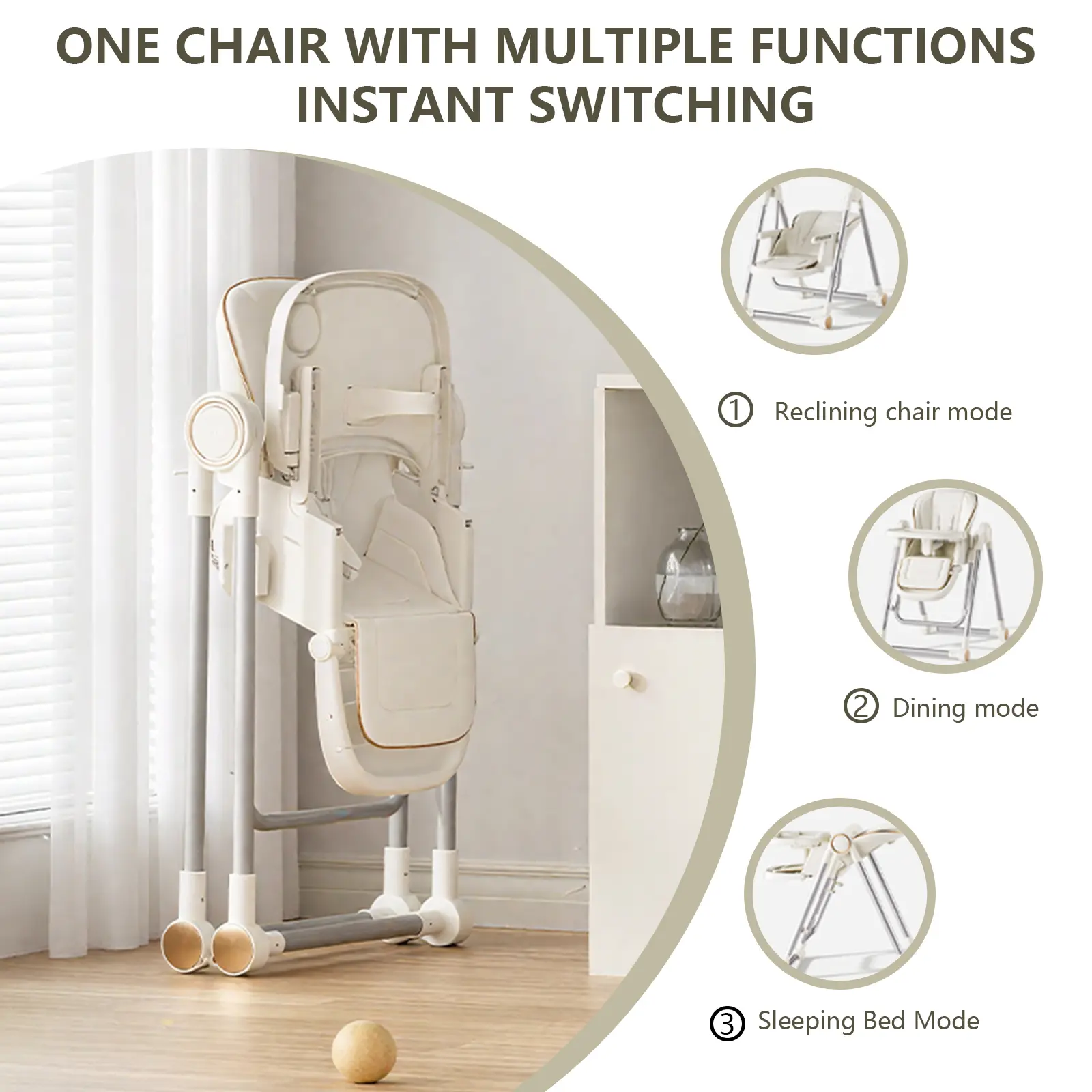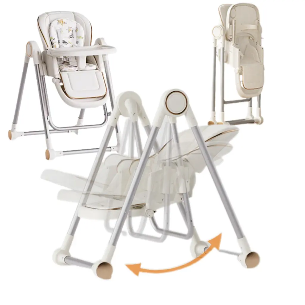 This high chair converts into a swing chair, offering convenience for feeding and relaxation. It's a versatile choice for both mealtime and downtime. The design focuses on meeting baby's feeding and resting needs efficiently. Perfect for homes with limited space or families on the move.