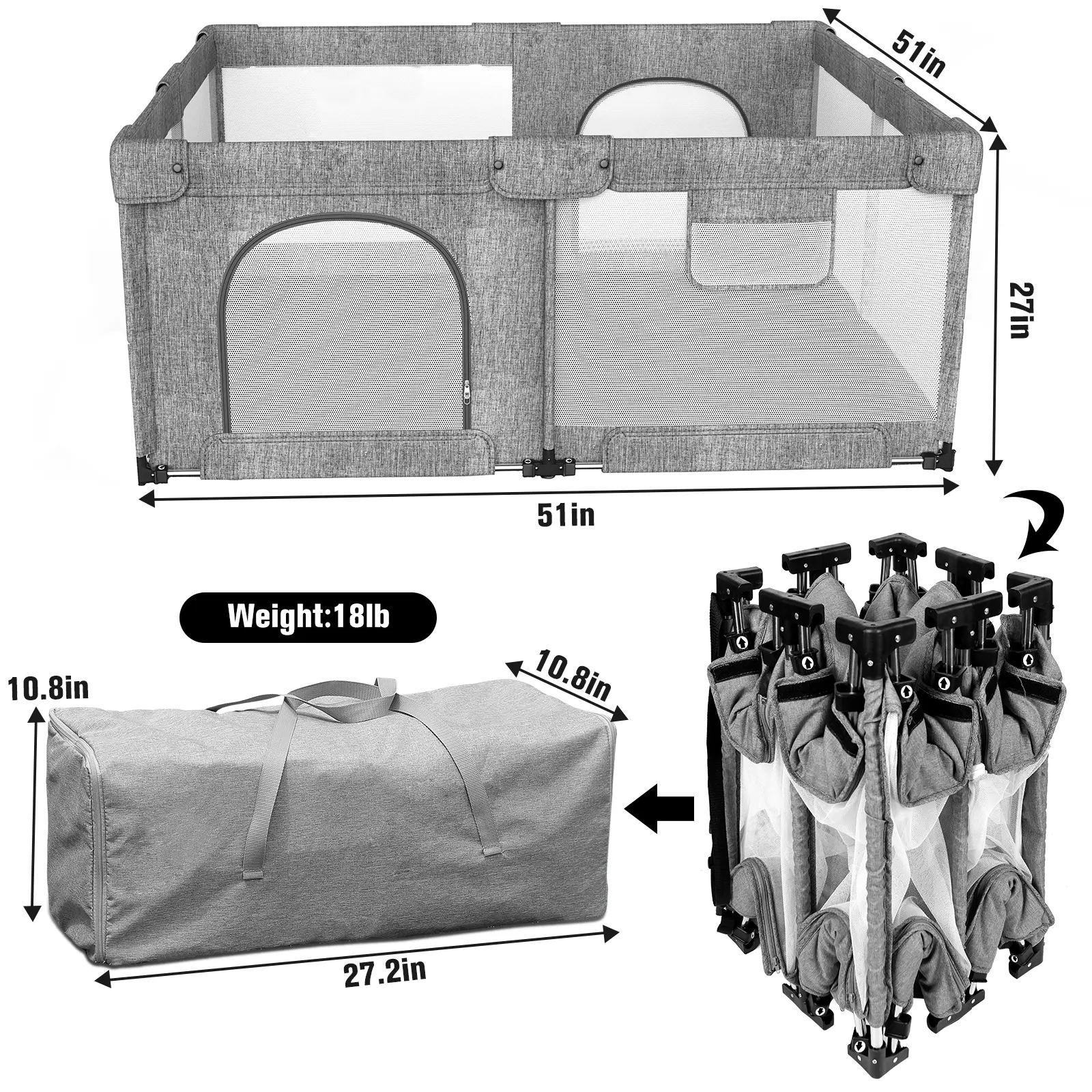 Foldable Baby Playpen,Collapsible Playpen for Babies and Toddlers, Extra Large Foldable Playpen for Baby with gate, Baby Activity Center with Fence, Travel Play Pen (Black/grey51"×51")