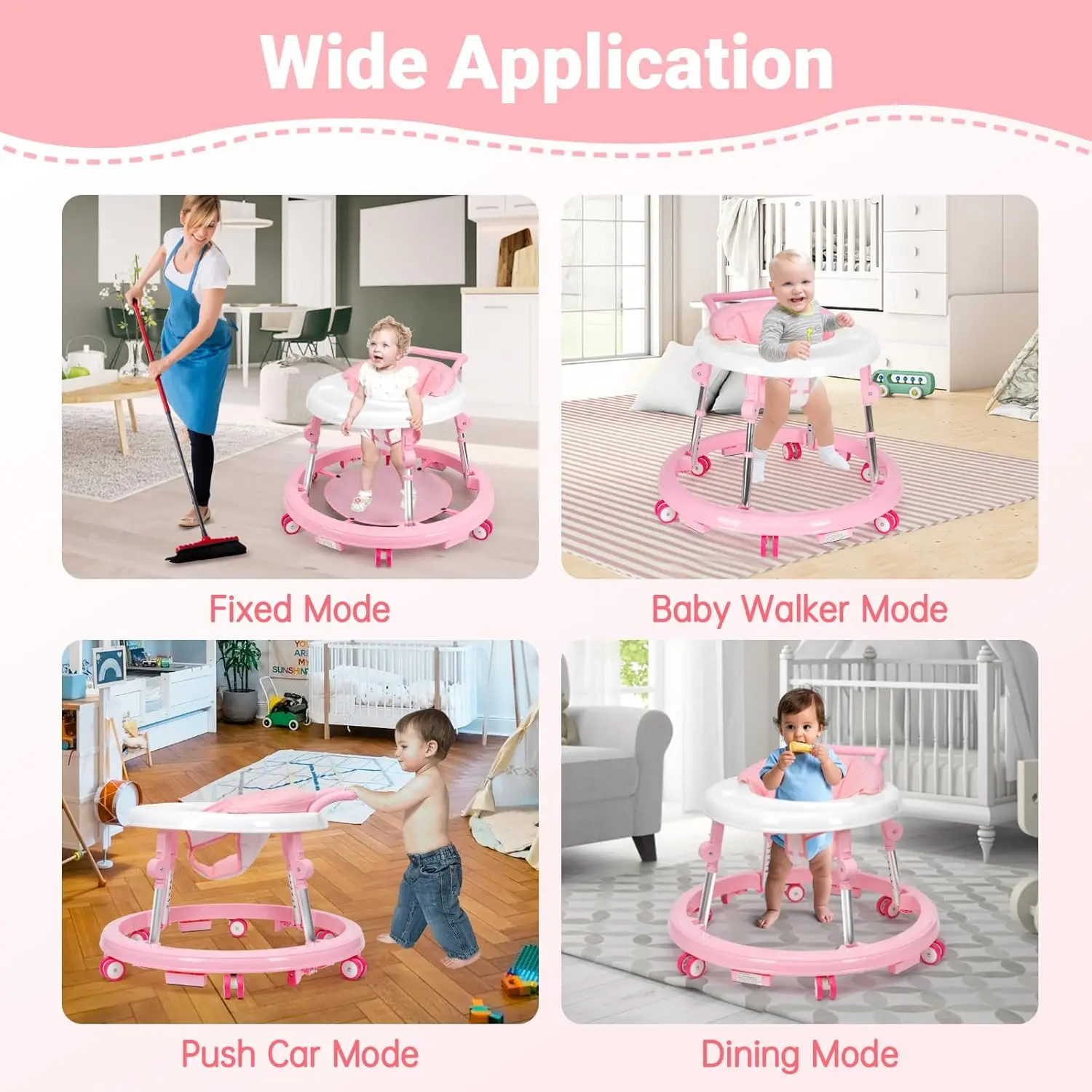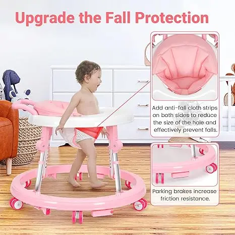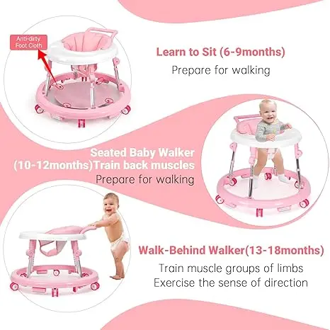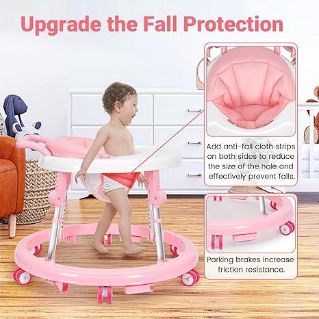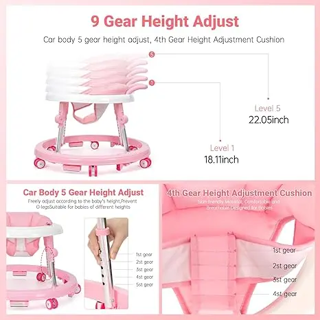 ·[9 gear height adjustment]: Our baby walkers for boys and girls have 9 gear adjustment modes, including 5 gear adjustment for the body and 4 gear adjustment for the seat. Adjustable body height: 15.75 inch to 18.5inch. Adjustable seat cushions can provide your baby with extra support and a comfortable tilt. You are free to adjust the appropriate height according to your baby's height to prevent O-legs.